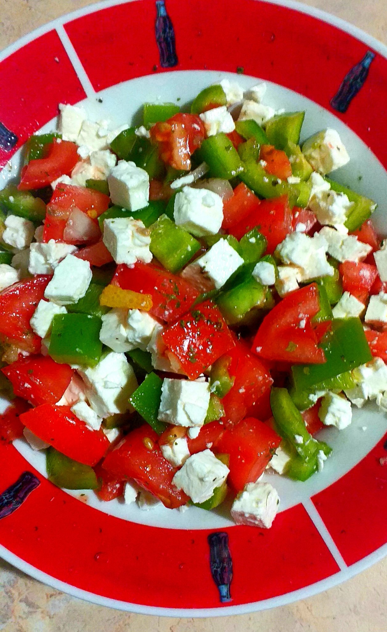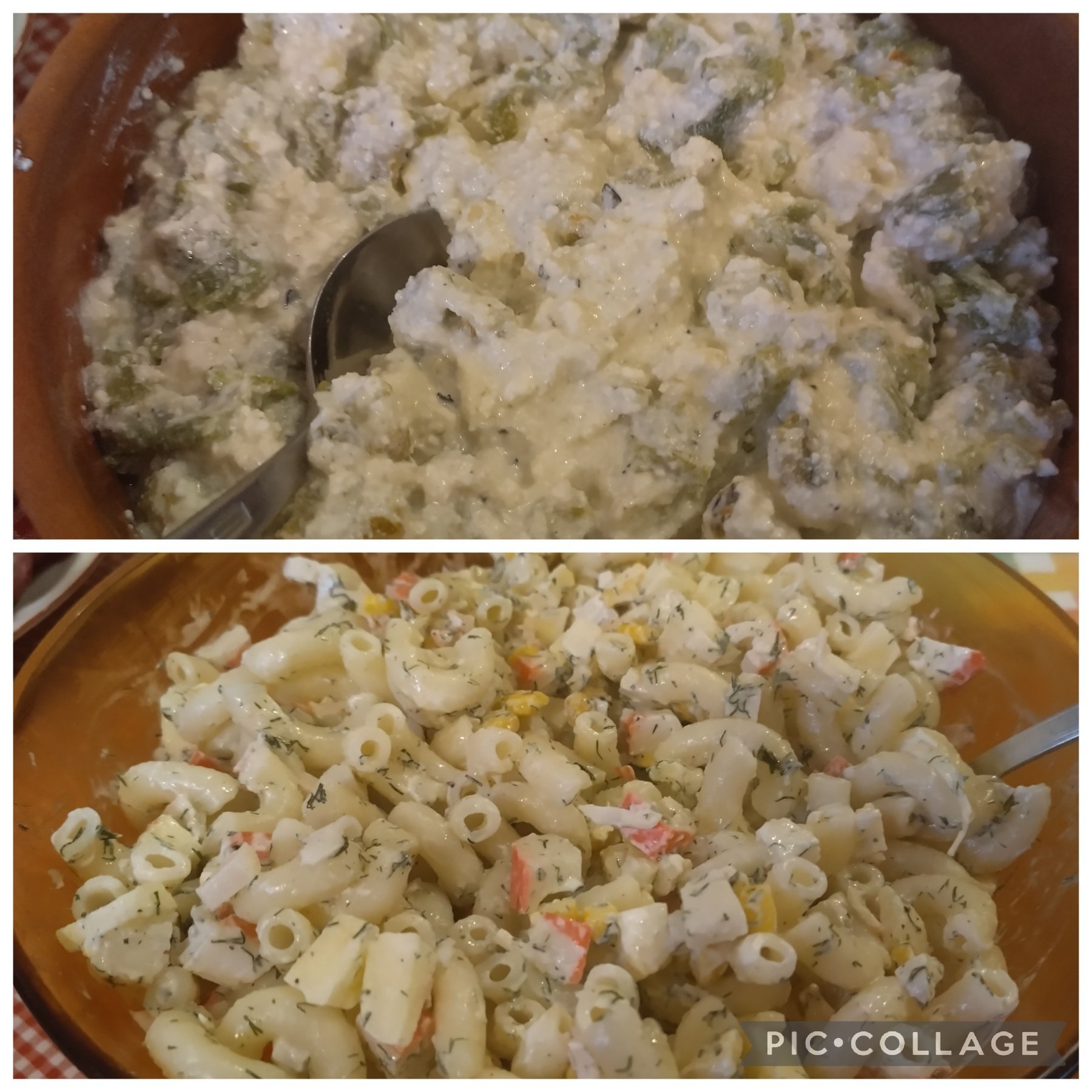 Разядка със зелени чушки и салата с макарони и рулца от раци
