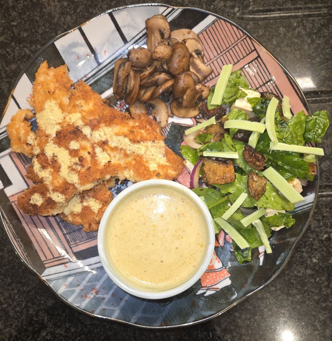 пиле катцу със сос , салата от спанак и патладжан