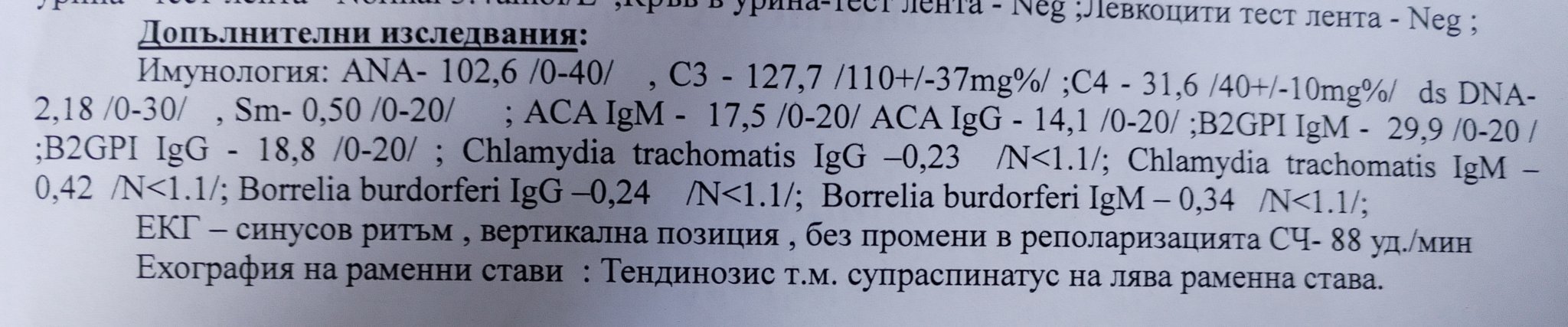Погледнах сега изследванията, завишени B2gpi говори за анрифосфолипиден синдром, който се свързва точно със затруднения в забременяването и износването на бременността, та определено имунолог, антителата ANA са адски високи.