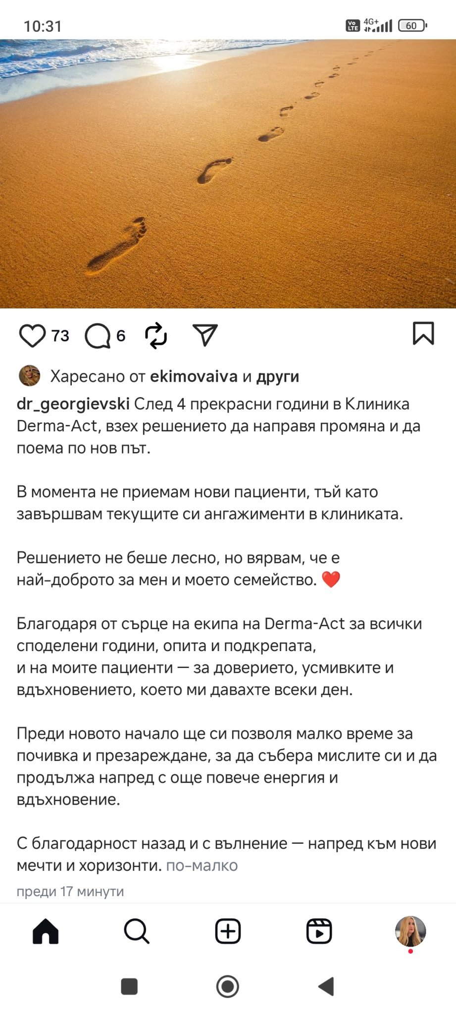 Георгиевски вече няма да работи в Дерма акт. Публикувал е в Инстаграм профила си току що.
