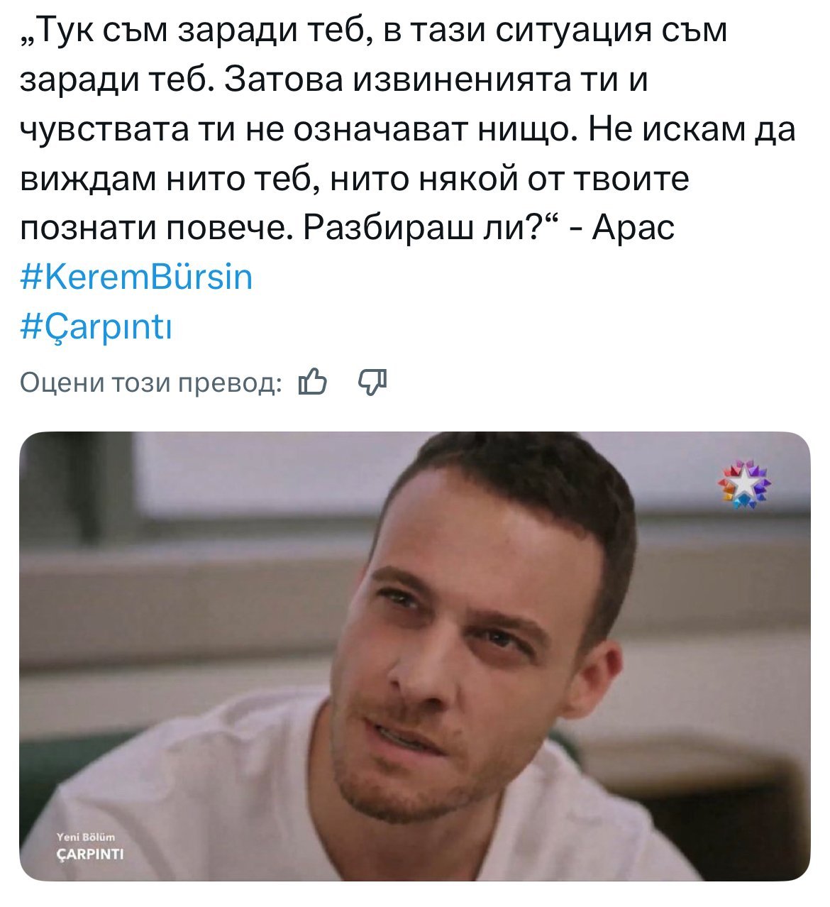 Сега ми попадна мнение на фен, че е възможно да направят Арас с дисоциативно личностно разстройство и той да е замесен в инцидента с Мелике. Така обясняват и разминаването на сцените във 2-ри и 6 еп. Единият е лош и е имал чувства към Мелике, а другия идея си е нямал, че тя е влюбена в него.