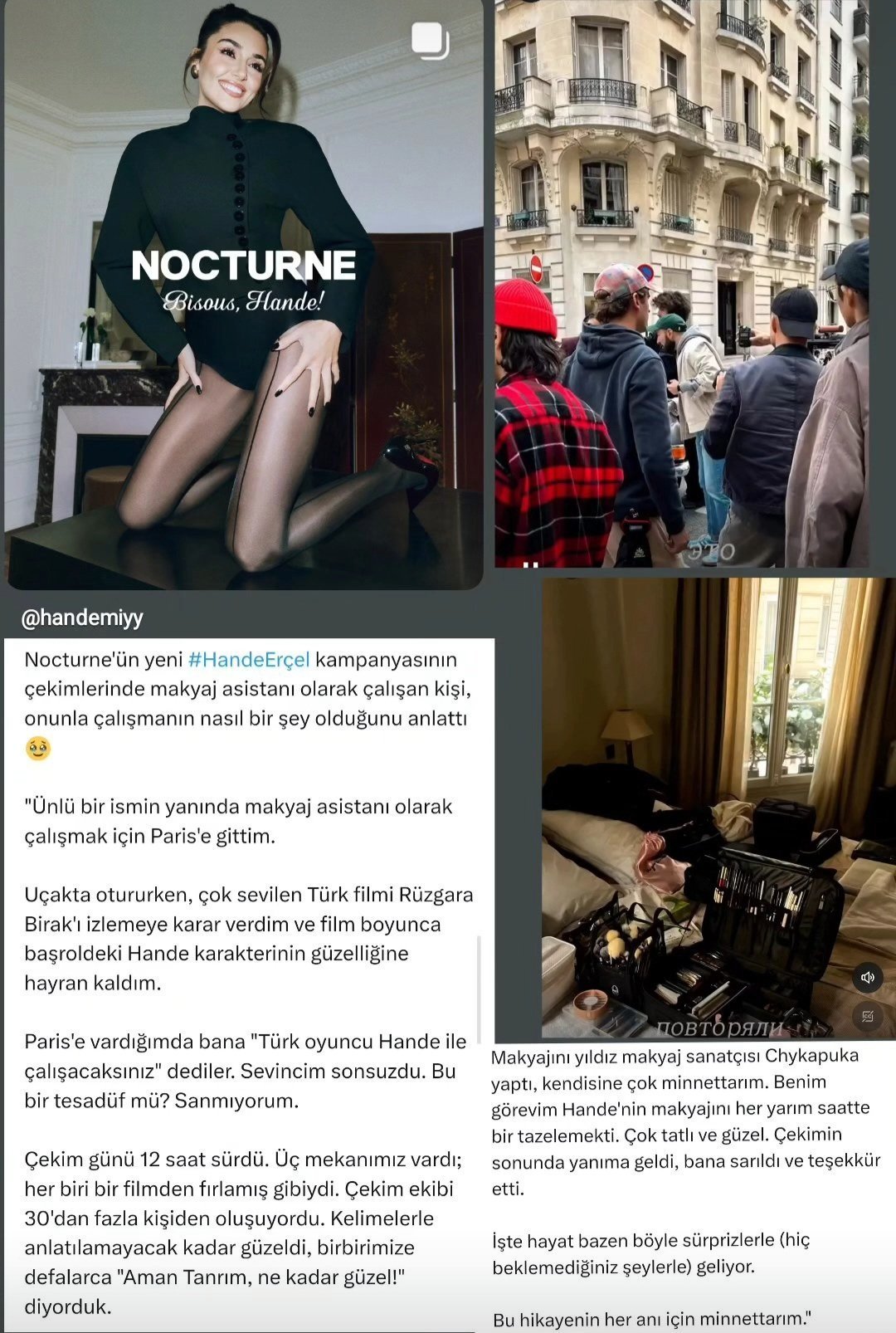 Kиргистанска гримьорка, участвала в новата фотосесия на Nocturne в Париж, изрази щастието си от работата с Ханде Ерчел и сподели преживяванията си от снимачната площадка: 🥹❣