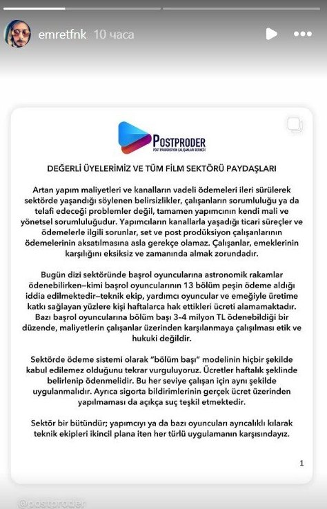 Докато главните актьори в днешната телевизионна индустрия могат да получават астрономически суми – някои се твърди, че са получили авансови плащания за 13 епизода – техническият екип, поддържащите актьори и стотици други, които допринасят за продукцията, прекарват седмици без да получат дължимото. В система, където някои главни актьори получават по 3-4 милиона турски лири на епизод, опитът тези разходи да бъдат покрити чрез персонала е неетичен и незаконен.