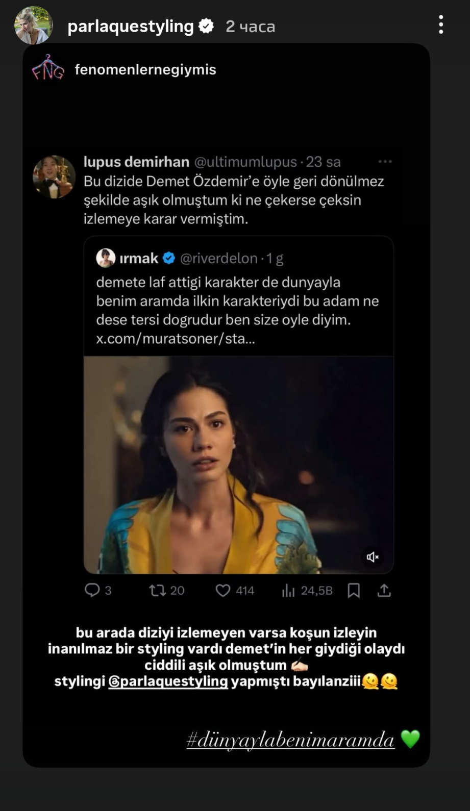 Демет отново споделя снимката с колежките Джерен и Ебру, докато си чакат снимките пред дома на Нисан Coffee Този път от публикация с 19 фотоса на Джерен. А Парлак получава комплименти за стила на Илкин в "Между света и мен" дори няколко години по-късно Hands Clap