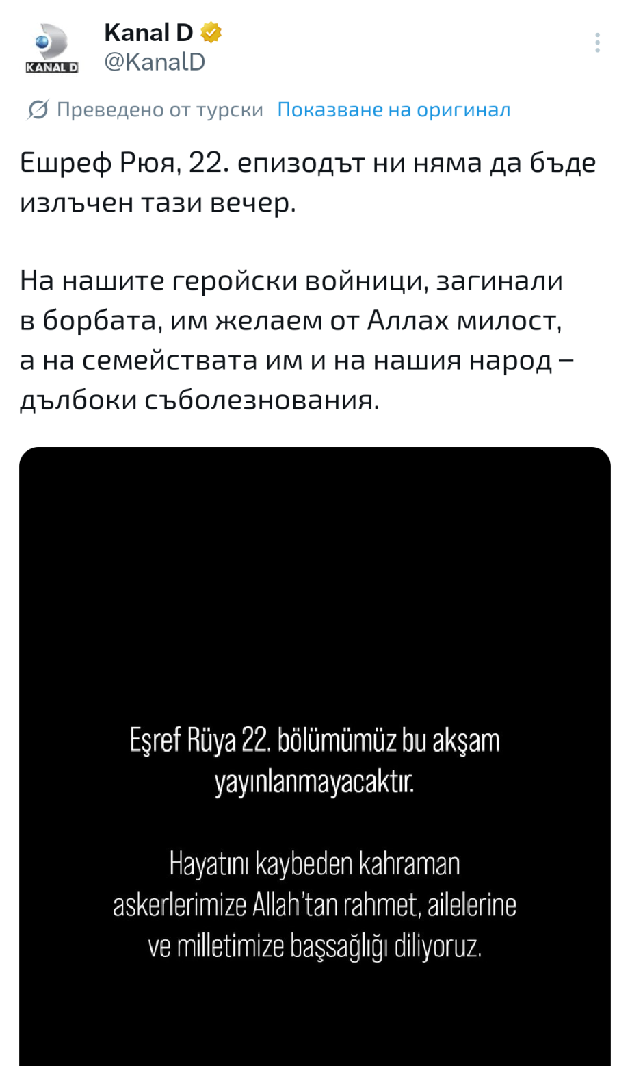 Жалко за рекламата, която направиха на 22 еп. на "Ешреф Рюя". Вчера пуснаха третия фраг часове, след като вече се знаеше за трагедията. Днес цял ден нямаше никакви признаци, че ще вземат решение за отмяна на излъчването, но уви...