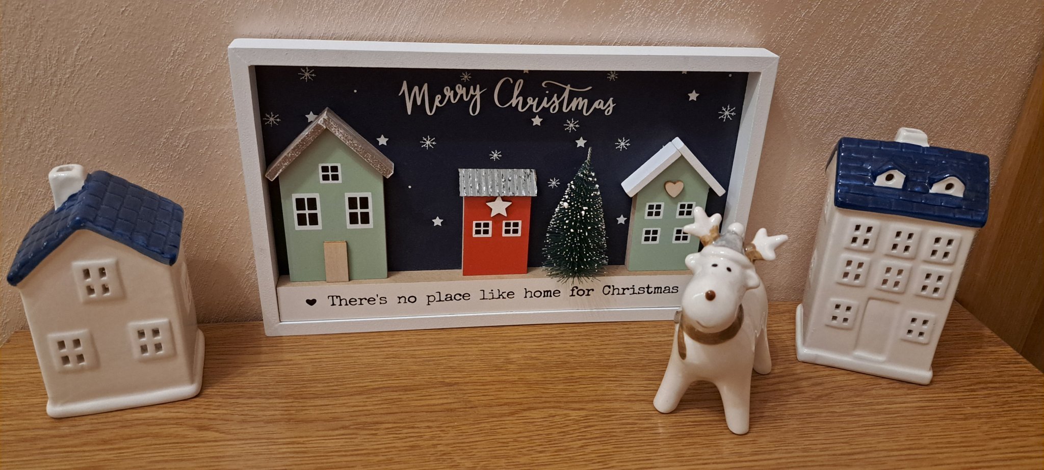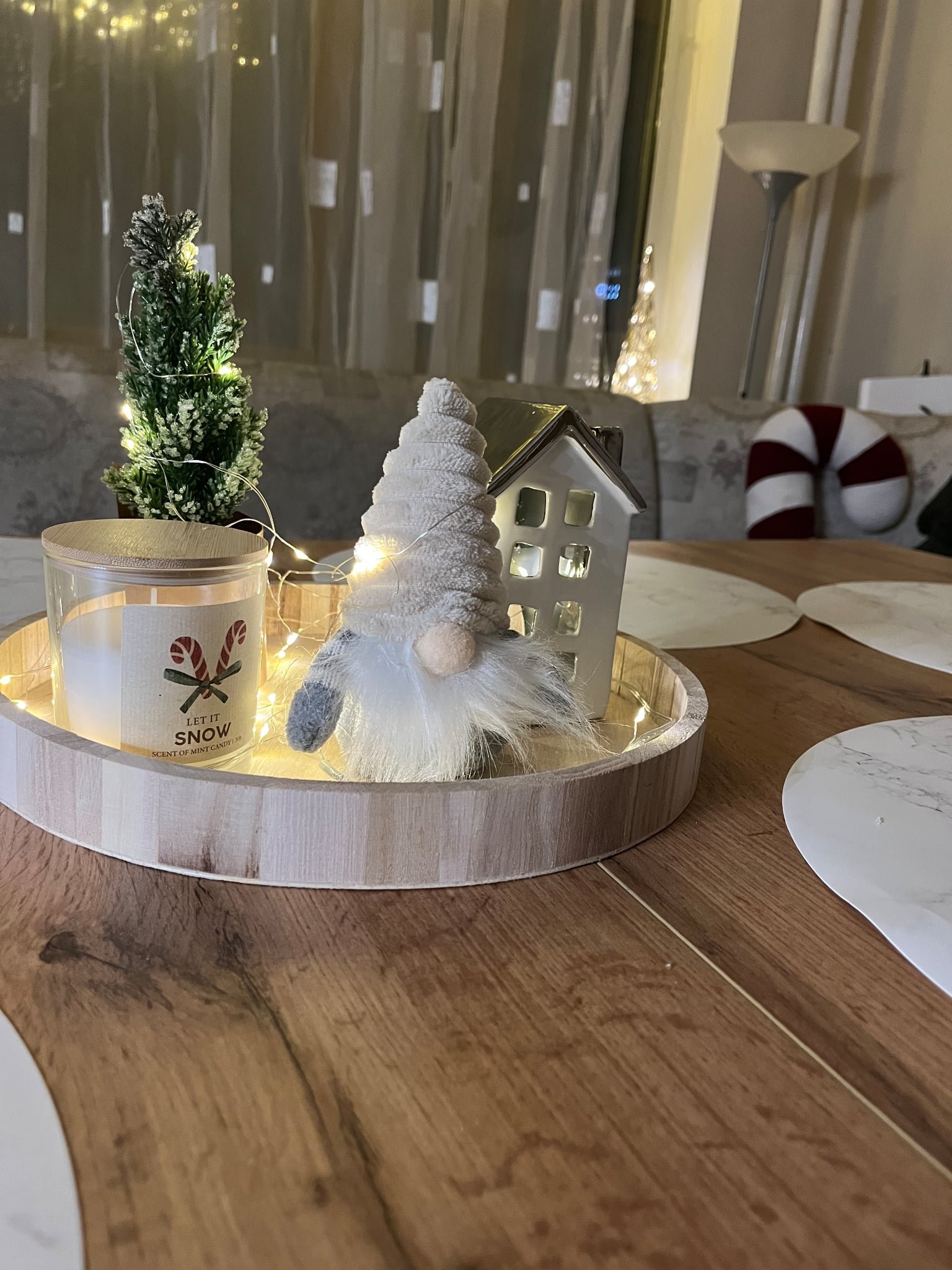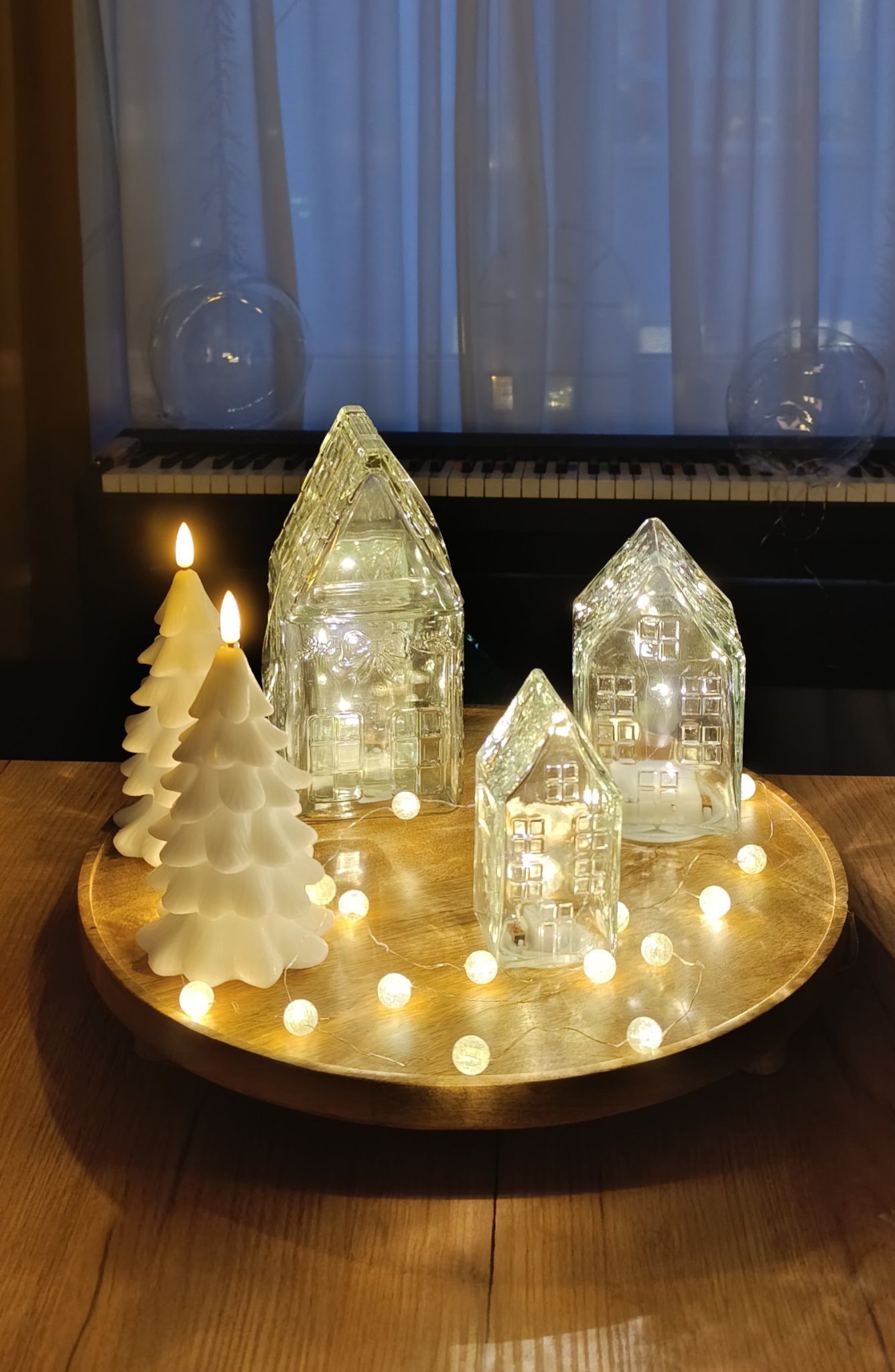 След бърза разходка в Jysk и Pepco, първа проба за декорация ). Елхички от Jysk, къщички и лампички от Pepco. По-високата къщичка всъщност е кутия за бисквити, вътре в нея сложих малка светеща къща)).