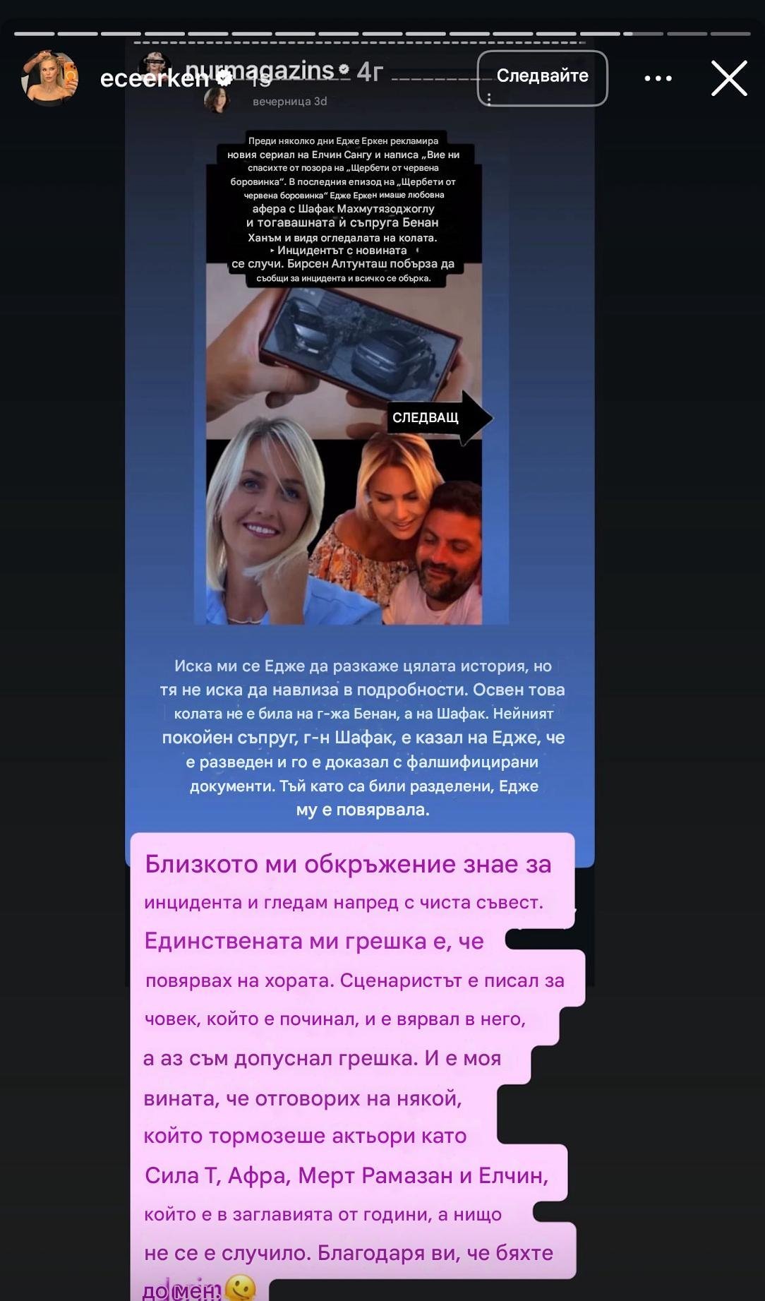 Невероятен скандал се вихри между Бирсен и Едже Еркен. Едже пусна това стори, в което твърди, че Бирса е тормозила актьори, включително Афра и Мерт.