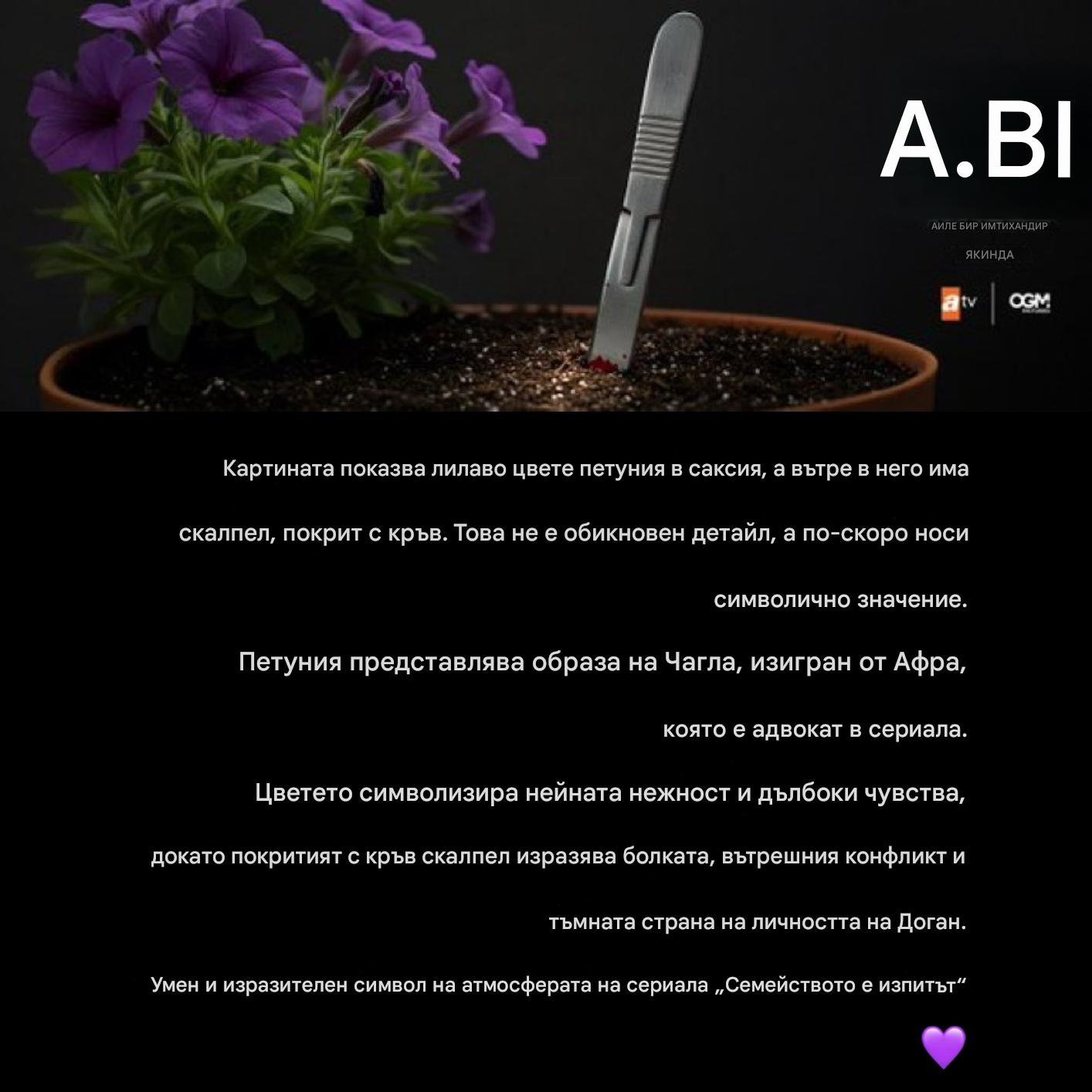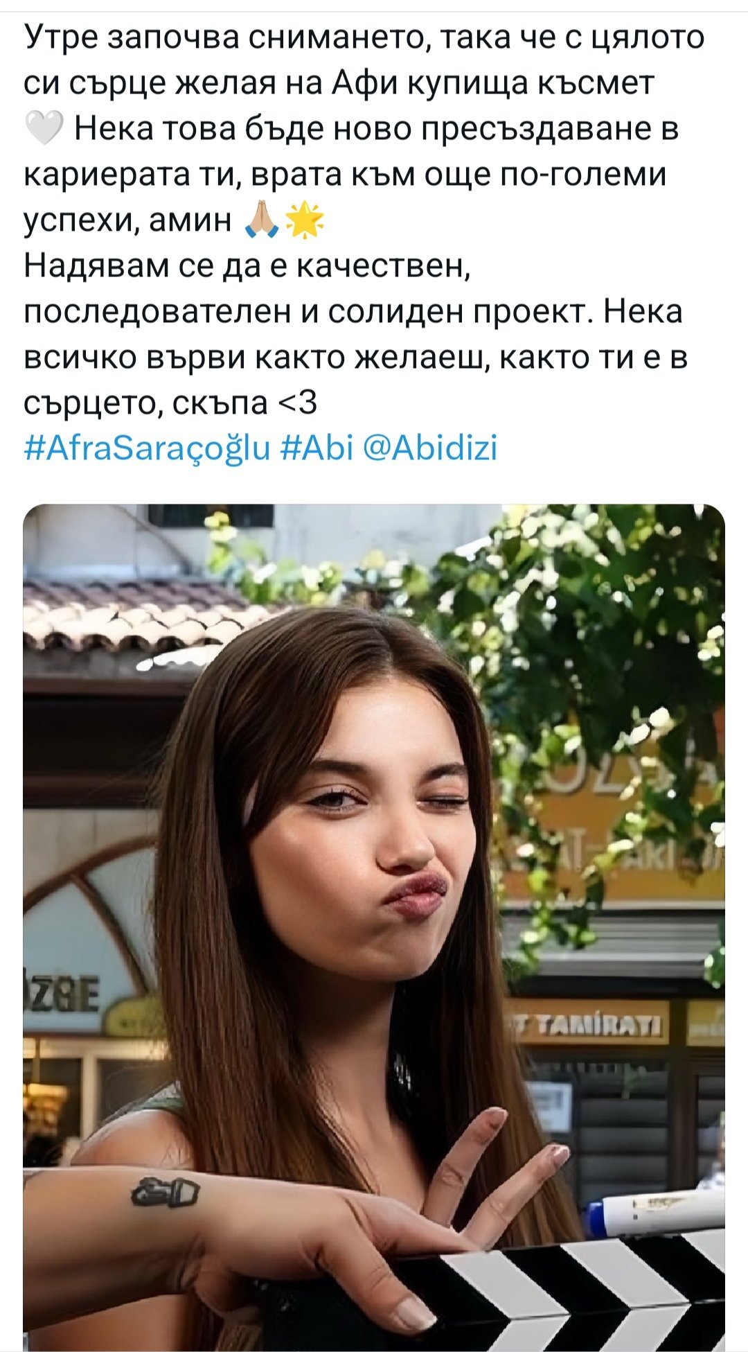 Да пожелаем на Афи успех,да изгради най-силният си и вълнуващ образ,ролята да и донесе професионално удовлетворение.Нека целият екип постигне признание и проекта да заеме челно място този сезон.