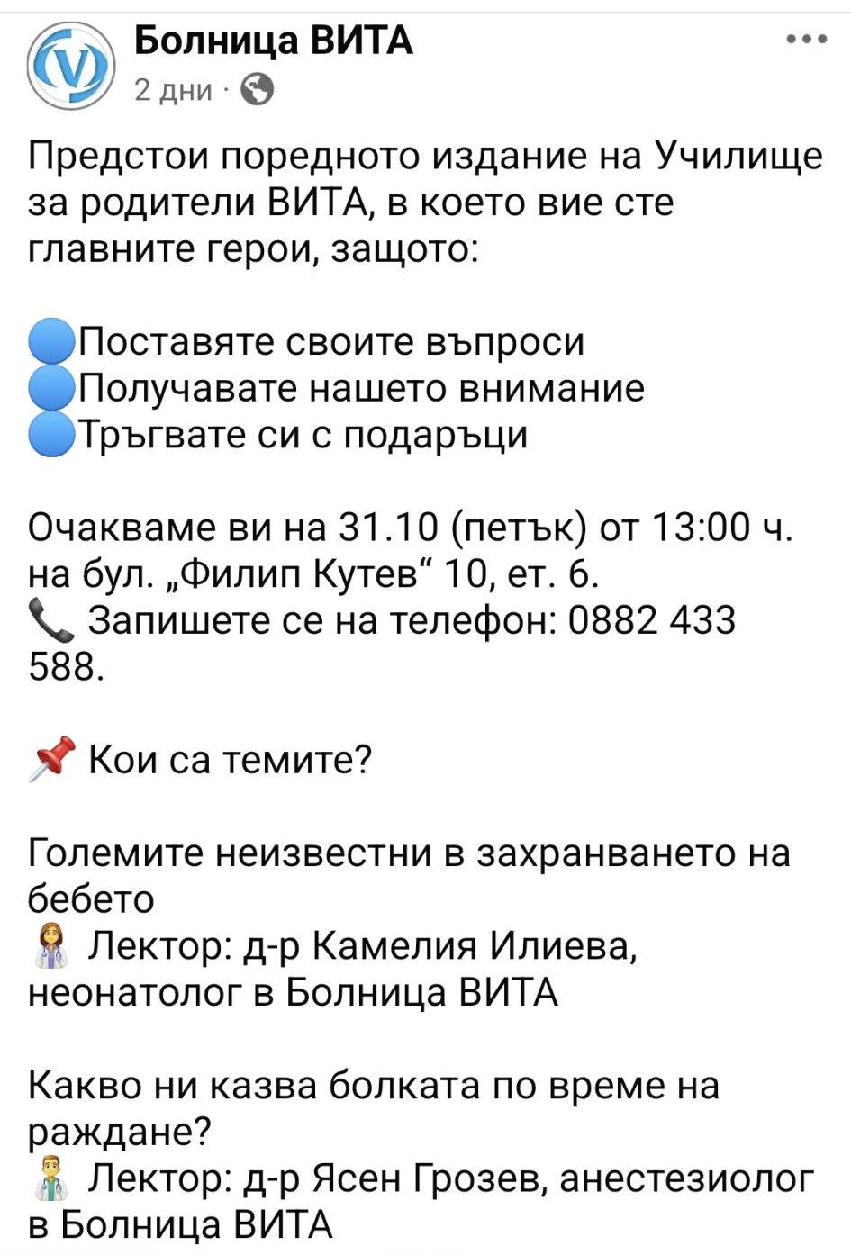 има Училище за родители в Болница Вита на 31.10.25г /петък/ от 13.00 часа на ет. 6, огранизират го всеки последен петък от месеца.