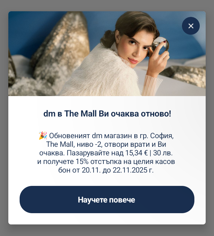 Откриват обновен магазин в The Mall и има отстъпка за цялата поръчка, но с това условие: Отстъпката важи само от 20.11. до 22.11.25 г. за dm магазина в гр. София, The Mall, бул. „Цариградско шосе“ 115, при покупка над 15,34 € | 30 лв. Отстъпката не се съчетава с никакви други талони и отстъпки, валидни за целия касов бон, включително и с отстъпка „Рожденик“.