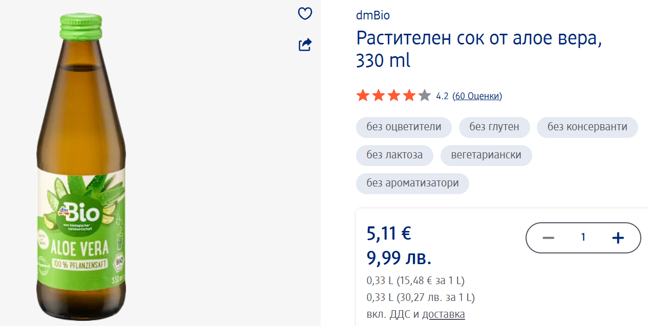Не съм предполагала, че сок от алое вера може да има толкова ужасен вкус... За съжаление не прочетох коментари преди да го купя и май ще трябва да го изхвърля. Има кошмарен вкус на лекарства, и то такива, които използват в стоматологията, дори добавен в плодов сок вкусът е натрапчив. Ще потърся информация дали може да се използва с друга цел, защото за пиене определено не става.