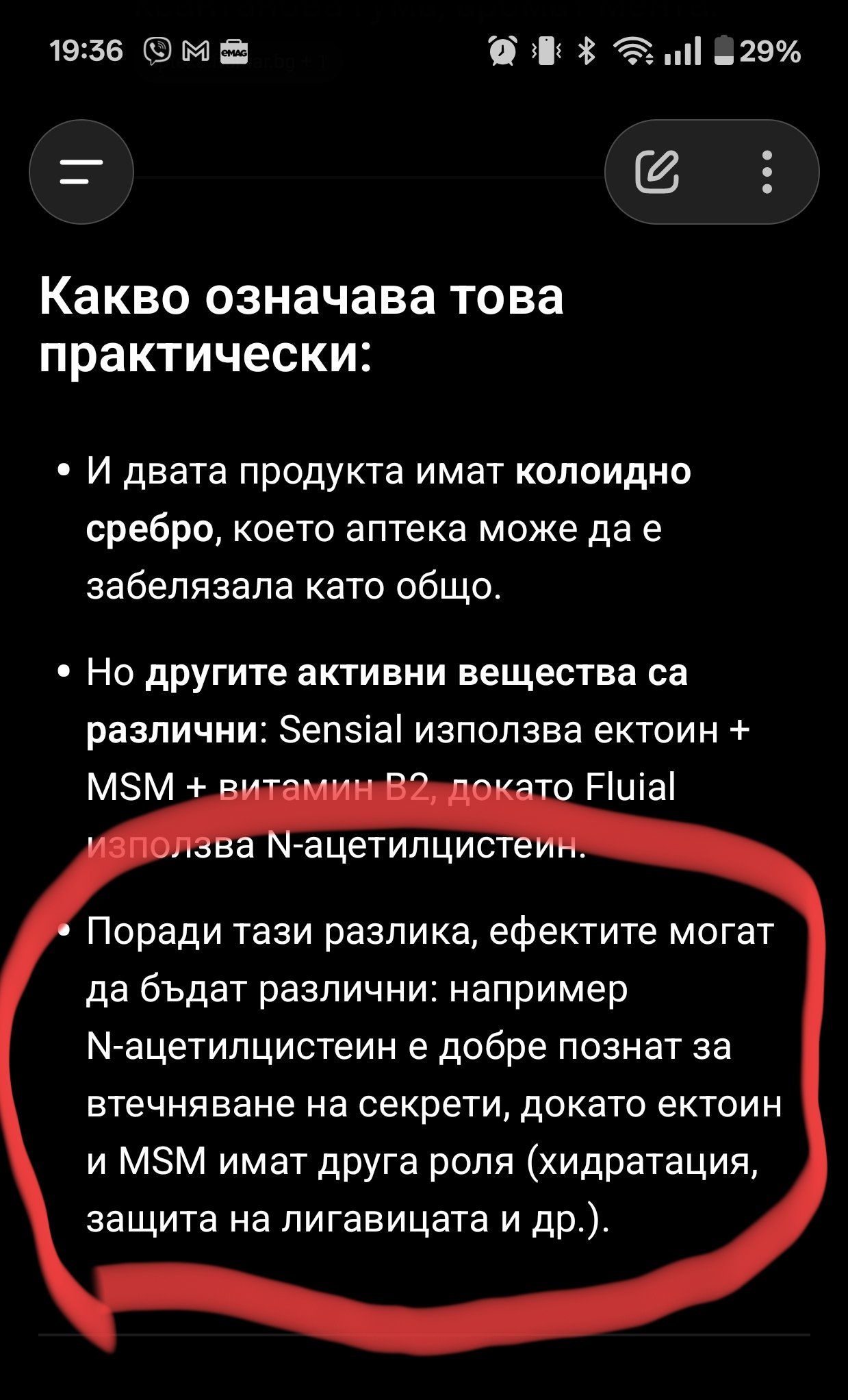 Аз хем писах да питам, хем не изчаках отговор, а направо изхвърчах до аптеката. Дадоха Сенсиал или нещо подобно, било 1:1 с Флуиал-а, но било капки, а не спрей. При малко екстремни условия излязох да го взема, та нямах време да ходя до другата аптека Sad
