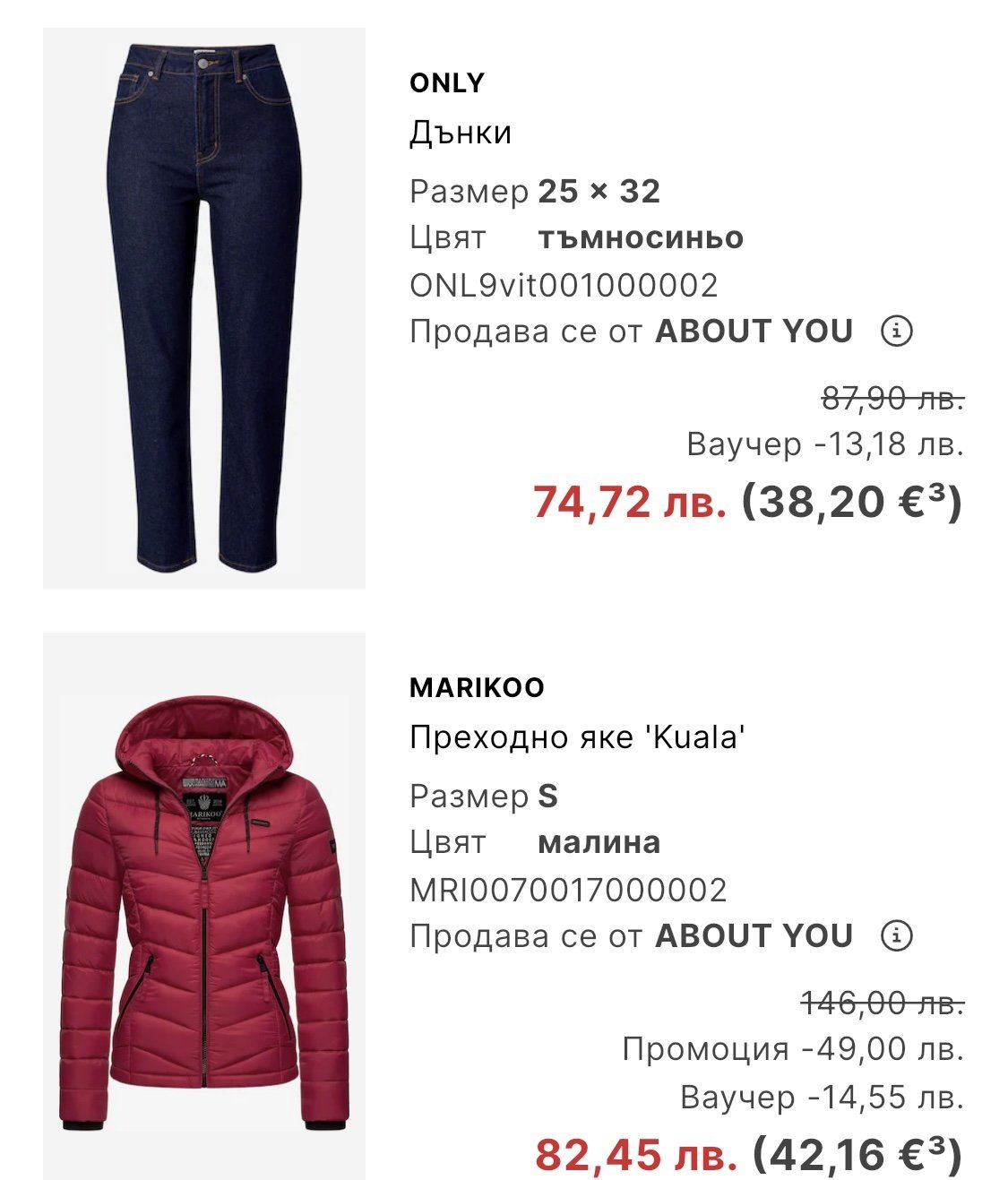 Днес получих тези, якето беше за мен, но не ми хареса- късо и пак стърчи долу, дънките са за колежка.