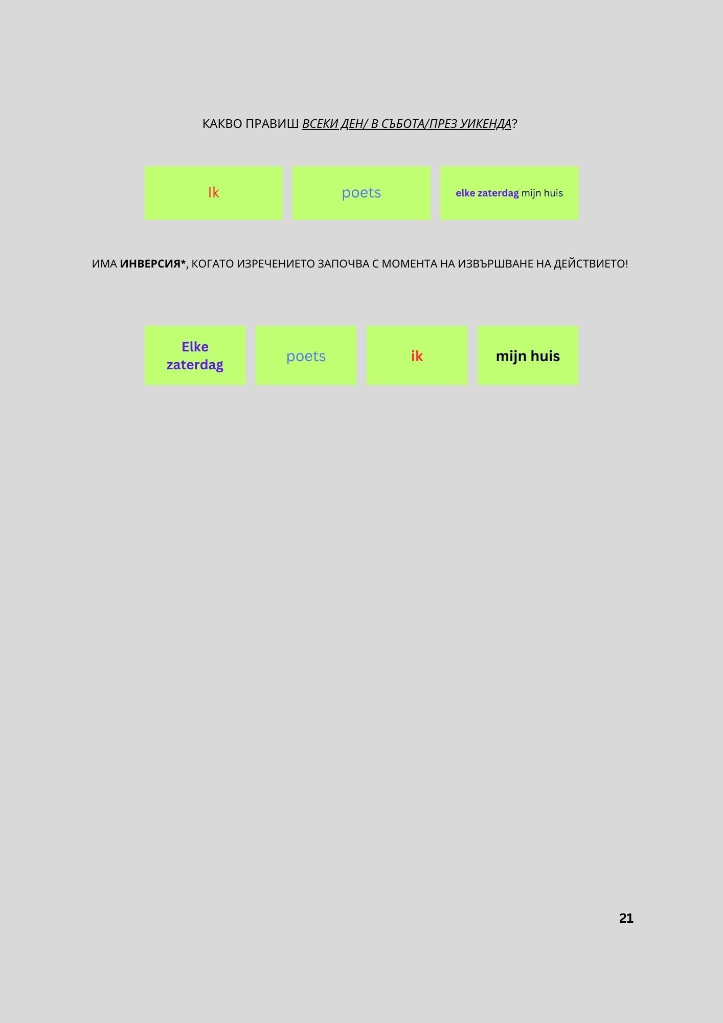 Hallo allemaal ! Интересувам се, дали има хора, които имат интерес към изучаването на нидерландски език? Аз започнах да го изучам през 2021 г. Няколко месеца преди да замина за Белгия, опитах да намеря ресурси, от които да уча. Първо потърсих в книжарниците в БГ и единственото, което намерих беше 1 разговорник - не го взех, защото не съм почитател на този метод за изучаване на език, когато си напълно начинаещ. После потърсих в интернет да науча основни думи и изрази. Когато пристигнах в Белгия се записах в програмата Nederlands als tweede taal /NT2/, но трябваше да изчакам няколко месеца, докато курсът започне. През това време си взех "Dutch in three months" на издателство Hugo. Оказа се, че не е добра идея, защото учех нидерландски език чрез английски. По този начин добих абсолютно грешна представа за нидерландската граматика. За щастие местните преподаватели по програмата NT2 ми показаха правилния начин за изучаване на езика им Relaxed