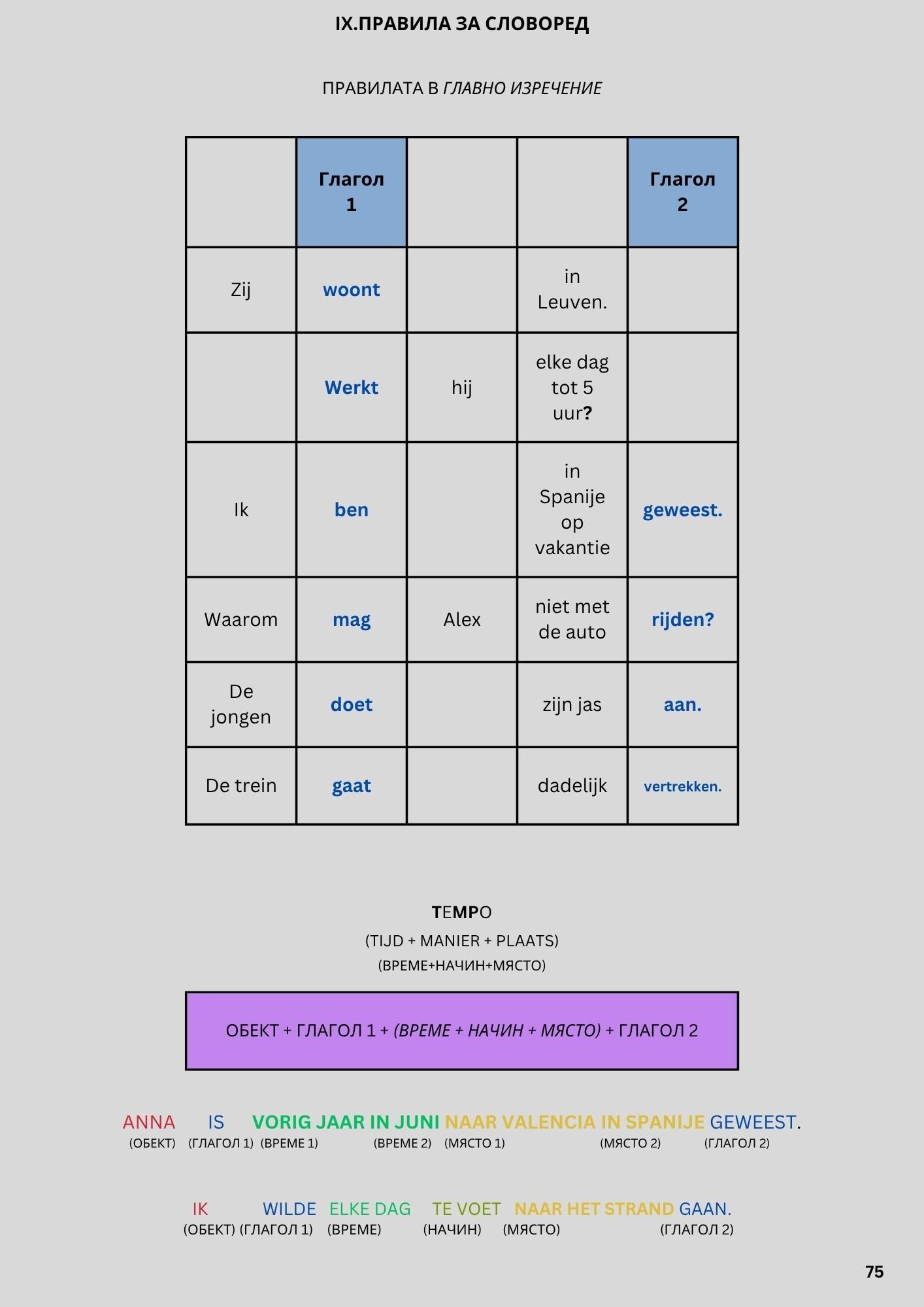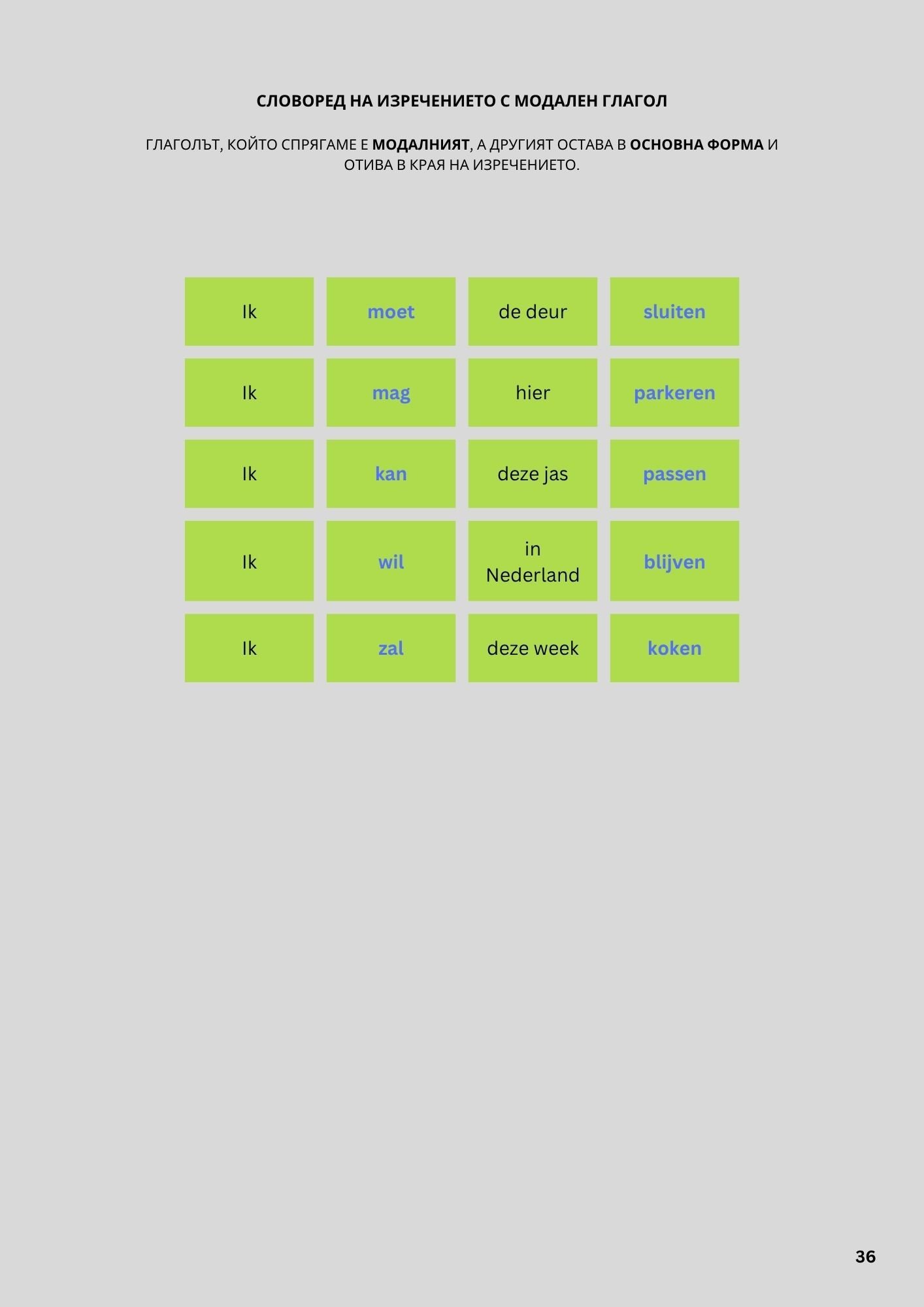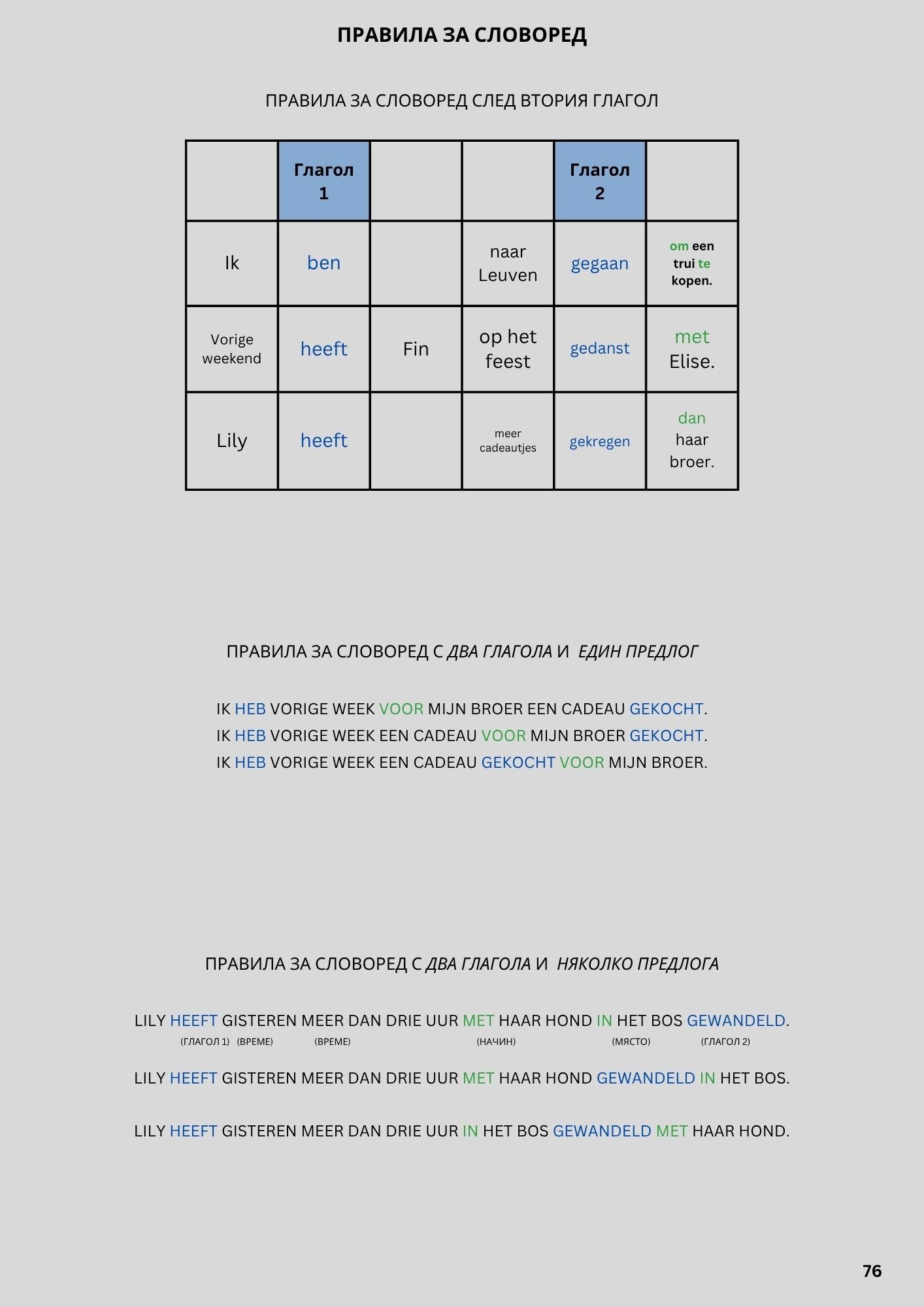 Страхотно начало и добре дошъл в клуба! Аз също започнах да уча нидерландски след преместване и минах през същото - „бързи" книги на английски само ме объркаха. Ако искаш, мога да обясня най‑честите капани с граматиката: най‑важното е правилото V2 (финитният глагол е на втора позиция в главни изречения) и че в подчинени изречения глаголите отиват в края. Пример: "Ik ga morgen naar school" (V2), но "Omdat ik ziek ben, blijf ik thuis" (глаголът в подчинената част в края). Също отделни приставки (scheidbare werkwoorden) променят мястото си - помагат да звучи естествено.