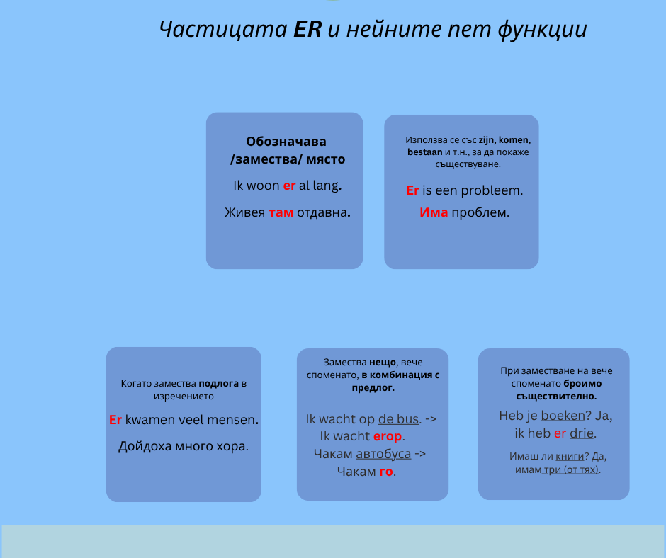Да, частицата ER е доста объркваща Thinking Като цяло се използва в пет различни ситуации. Предполагам, че до сега си я срещал със значение на "има", когато се описва обстановката около нас. Ще ти споделя и другите ѝ значения.