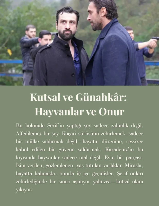 Това, което Шериф прави в този епизод, не е просто жестоко, то е непростимо. Отравянето на стадото Кочари не е просто нападение срещу собствеността – това е нападение срещу световния ред, срещу тихо прието доверие. На този бряг на Черно море животните не са просто собственост. Те са част от домакинството. Те са назовавани, наблюдавани и завещани същества. Те са преплетени с наследство, оцеляване и чест. Когато Шериф ги отрови, той не прекрачва граница – той просто унищожава това, което е свещено.
