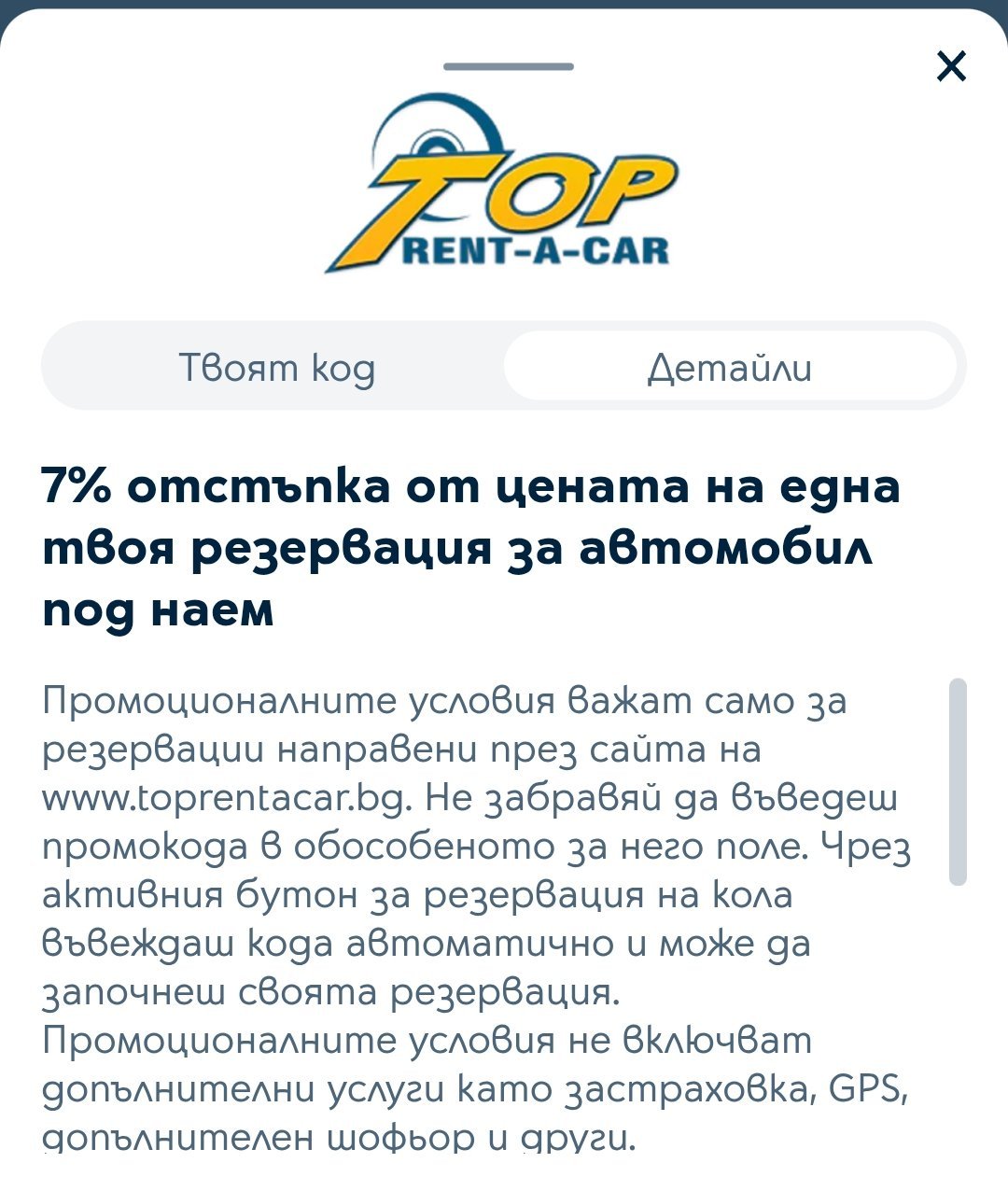 Топ рента Кар 7% отстъпка с код. Пишете ми за да го дам