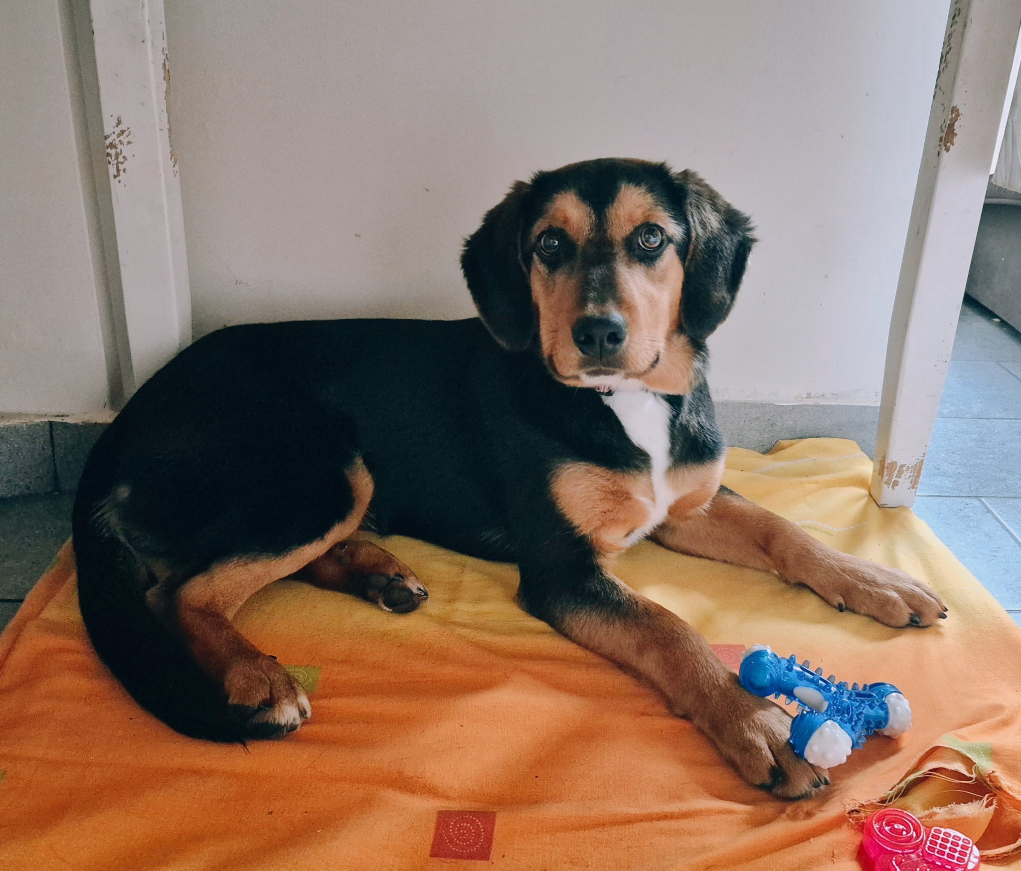 Там стоеше Харли, когато оставаше самичък първите 2 години. Още си стои масата с наръфаните й от него крака, нарочно не я подменяме. Аз тихичко пак да похваля момичето. Нощта е преминала спокойно. По някое време си е играла под масата с една играчка, даже е успяла да си скъса чаршафа. Изведох я към 7.30 сутринта и веднага се изпишка и изака. Пу-пу, да не й е уроки!