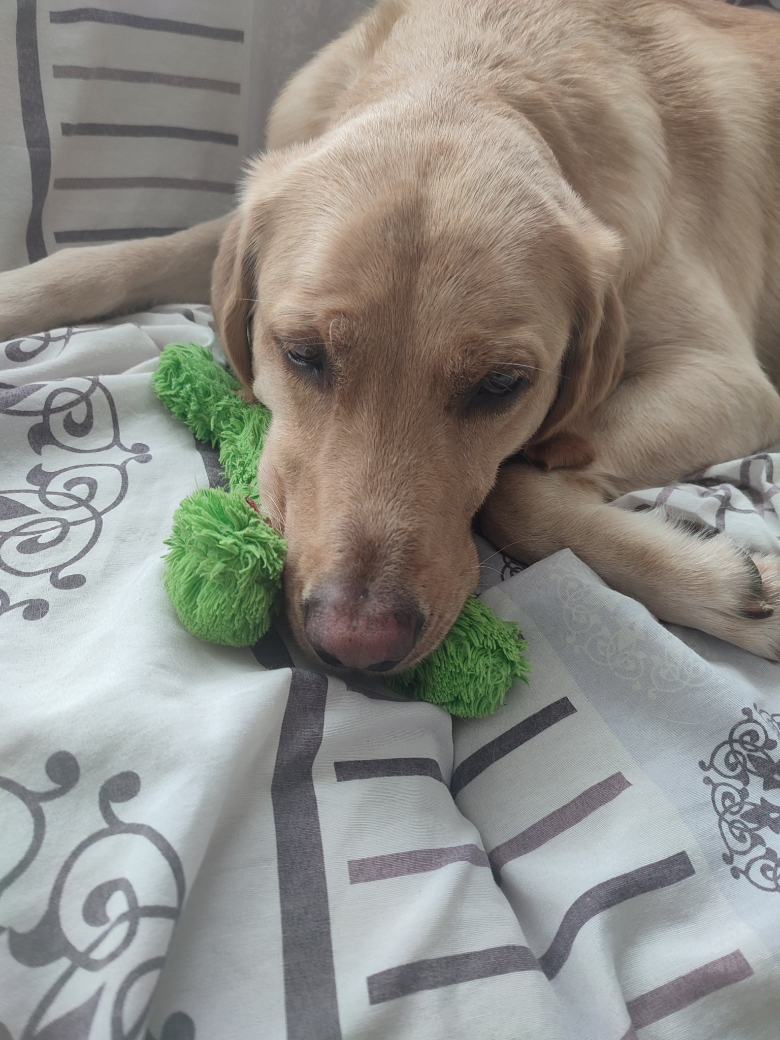 Най-много обича топки. Големи, малки - топка да е. И писукащи харесва, но за минути им премахва врякащата част. Хубавото е, че не ги яде. Раздробява ги, но проблеми не е имал досега. На детето краде играчките, особено части от конструктори. Добре, че малкия не се сърди.