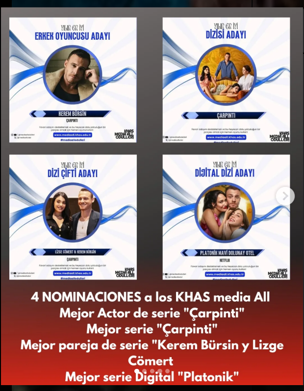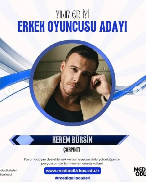 Името на Керем Бюрсин в наградите KHAS Media All Awards се появява в 4 категории: „Най-добър актьор в сериала“, „Най-добър сериал“ и „Най-добра двойка в сериала“, заедно с Лизге Кьомерт от #çarpıntı, и „Най-добър дигитален сериал“ от #platonikmavidolunayotel. Намерете линка за гласуване в нашата история. 🇪🇦🇹🇷