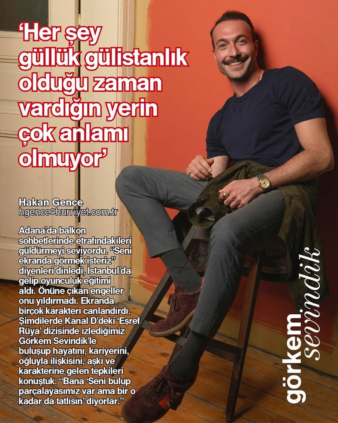 В Адана той обичаше да разсмива околните по време на разговорите на балкона. Той послуша тези, които му казаха: „Искаме да те видим на екрана“ и дойде в Истанбул, за да се занимава с актьорство. Препятствията, с които се сблъска, не го отчаяха. Той е изиграл много роли на екрана. Срещнахме се с Гьоркем Севиндик, когото гледаме в сериала „Есреф Рюя“ по Kanal D, и разговаряхме за живота му, кариерата му, отношеният а му със сина му, любовта и реакциите към героя му: „Казват ми: „Искаме да те намерим и да те разкъсаме, но ти си толкова мил".