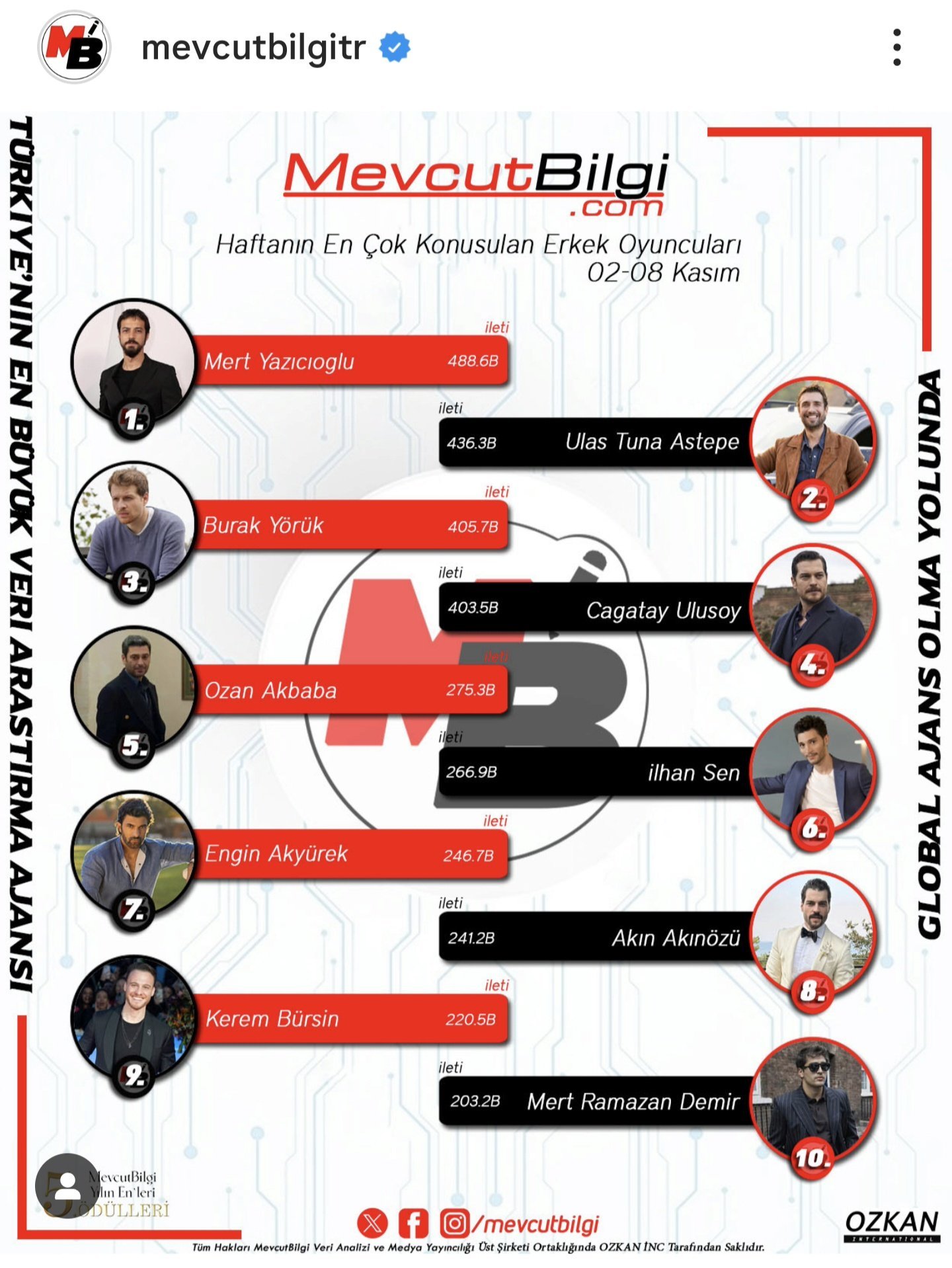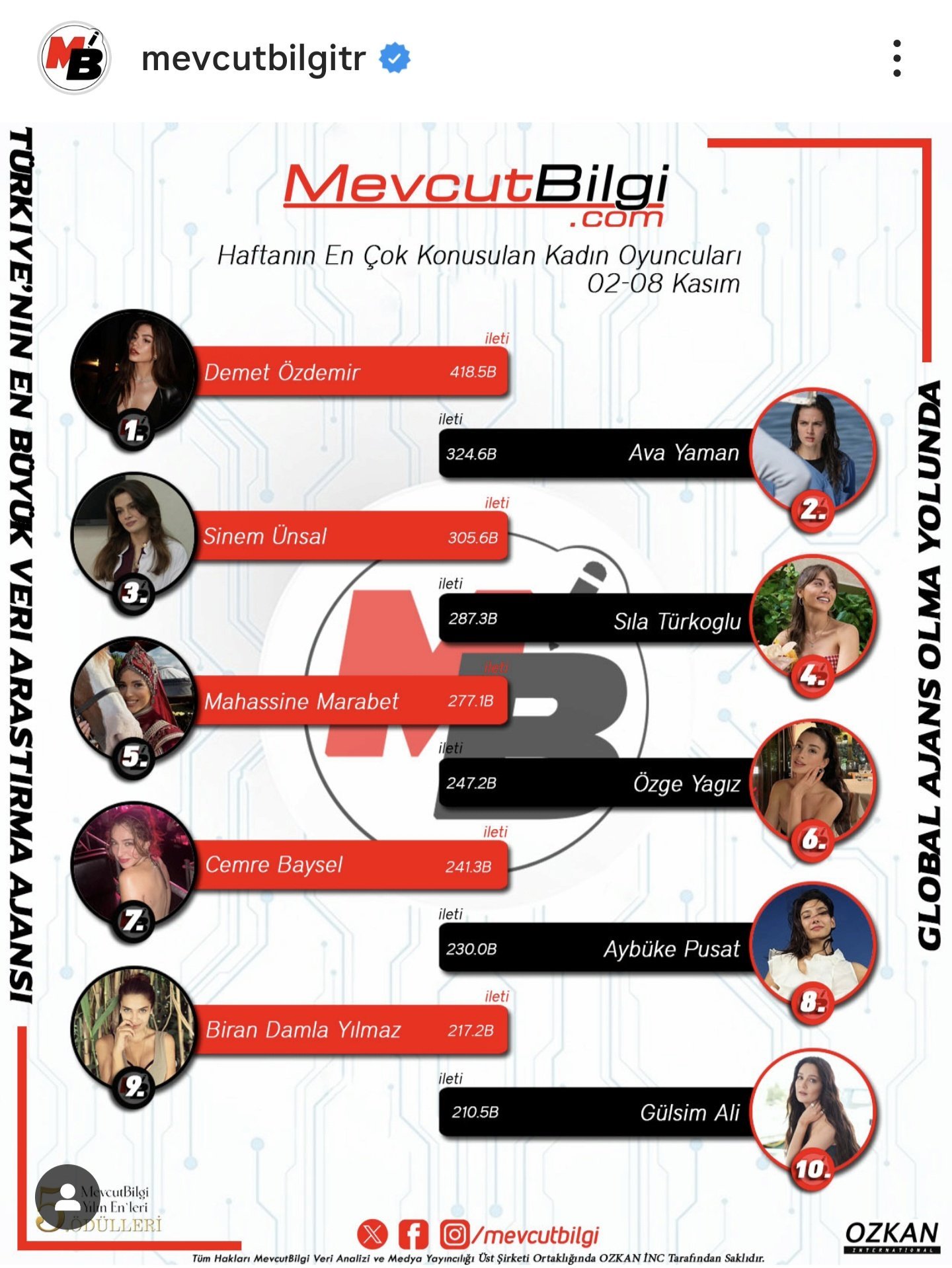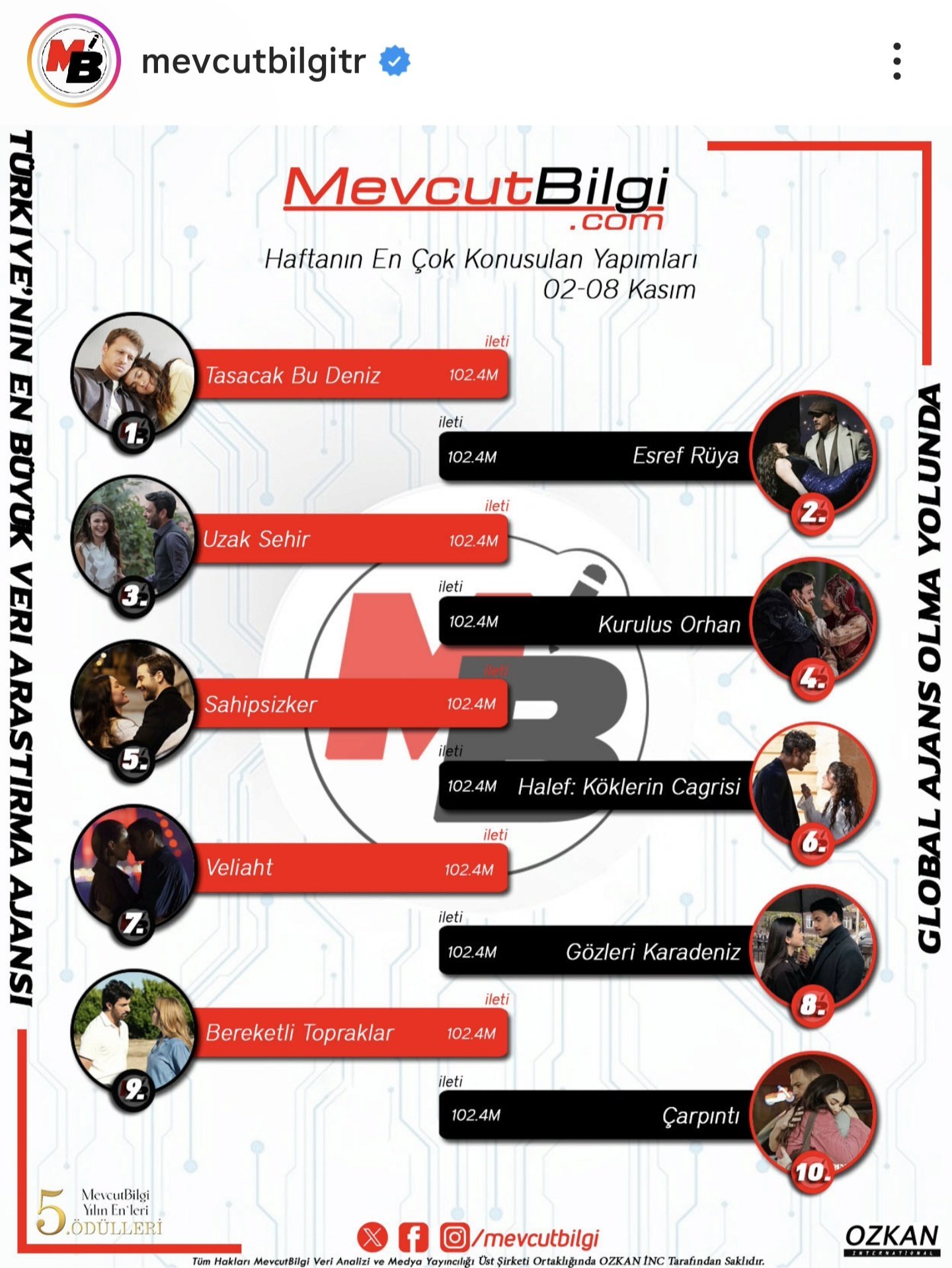 През изминалата седмица в класацията Mevcut bilgi, "Eşref Rüya" отстъпи първото място на "Taşacak Bu Deniz".