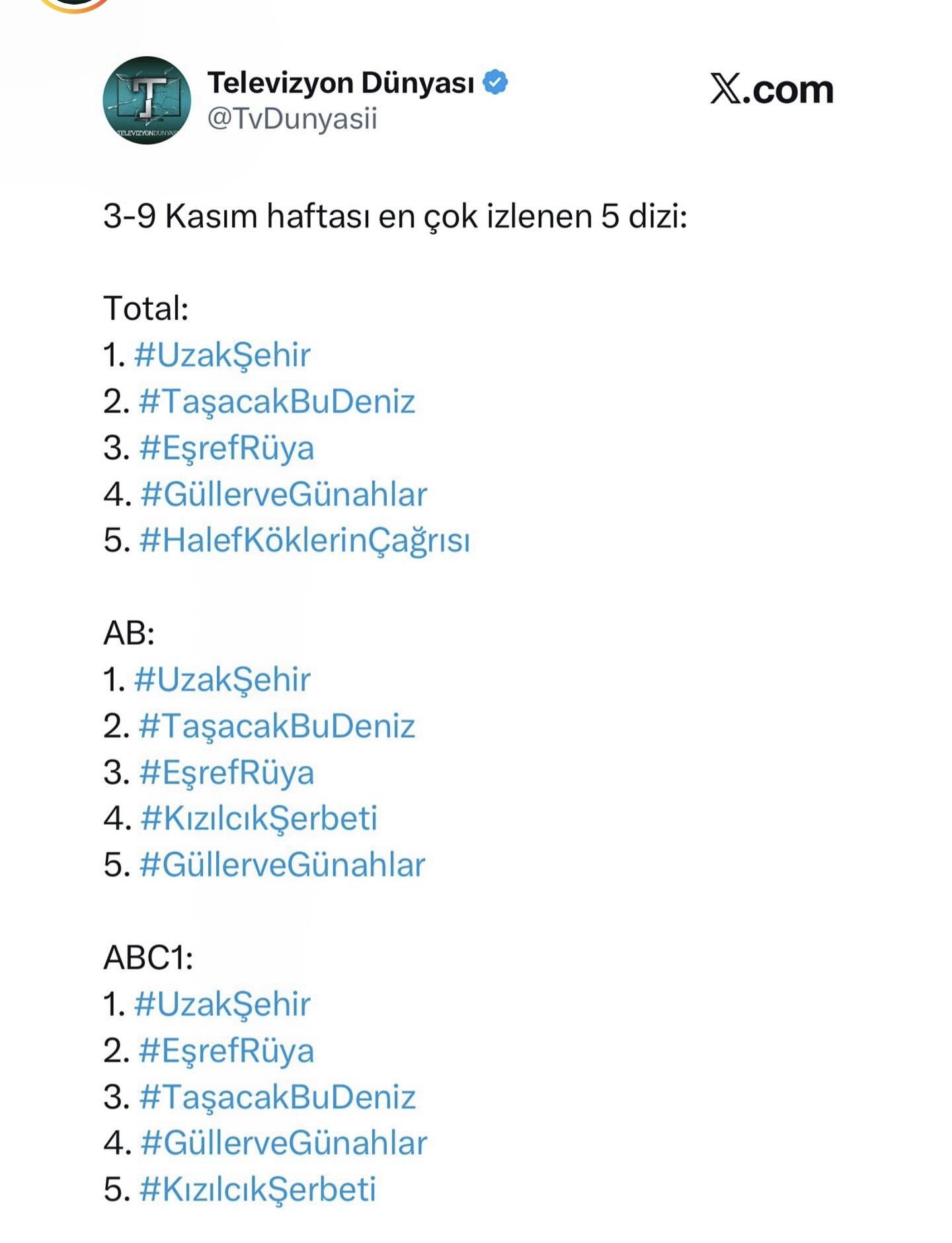 През изминалата седмица в класацията Mevcut bilgi, "Eşref Rüya" отстъпи първото място на "Taşacak Bu Deniz".