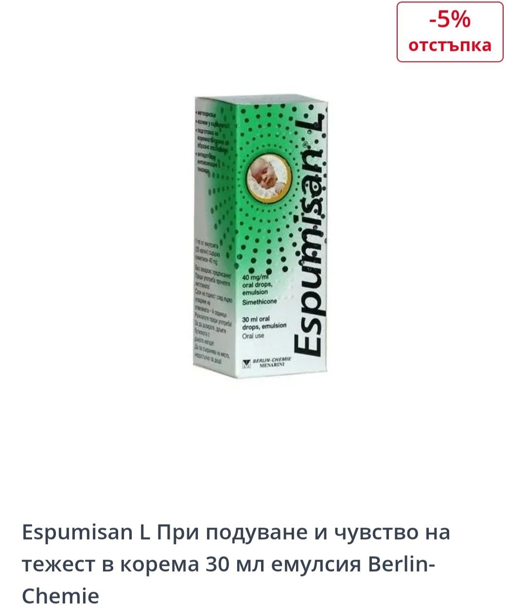 - Еспумизан Л 40 мг на мл 25 капки в храната макс 3 пъти на ден, т.к. запича