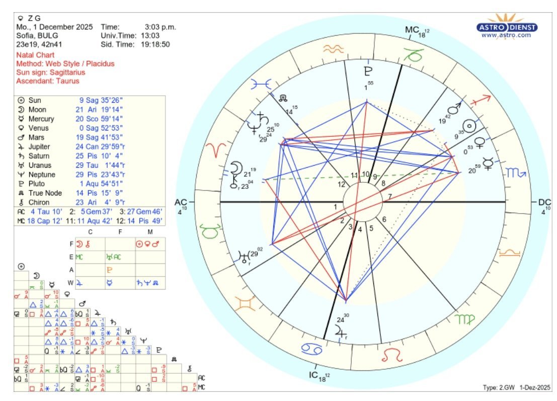 По общоприетия тропически Зодиак си с Асцендент в 16ия градус на Овен (15 градуса с минутки), ако гледаме с този час на раждане. Ако се прави хороскоп по ведическа (индийска) астрология, там се отчита с прецесия и Асцендентът ще отиде в Риби.