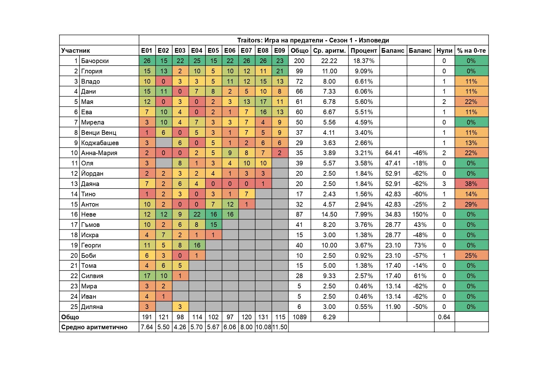 Много рано знаят кои са предателите /е, на Венц ратана още му е трудно да го асимилира, но за него е важно да си изпълни другата мисия, с която успешно се справя вече 9 епизода - да клюкари/, няма как да са в този състав до финала, не чух изобщо някой от тях дори да предположи какво би станало, ако трябва да се “пожертва“ праведен.