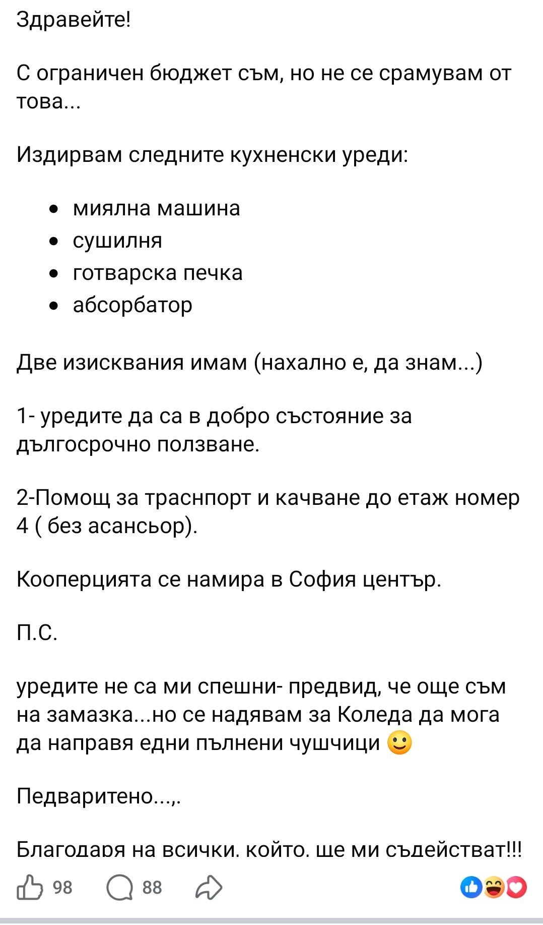 Не мога да повярвам вече ,не е срамно да нямаш пари,но да искаш уреди,които не са от първа необходимост,че и условие за качване . Значи аз хем трябва да ги подаря ,хем да го играя хамалин. Единствено бих подкрепила за отоплителен уред,готварска печка и хладилник.