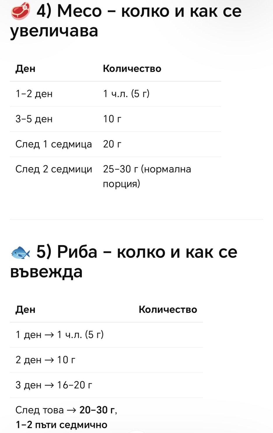 Пупи, ние сме така. Още удържаме положението с три млечни хранения. Второто в 9 яде много малко 60-90 мл и смятам да минаваме на попара, но имам спомен, че с голямата имаше проблем с млечните и по-скоро ще давам пак каша. Проблемът е, че не ги харесваше в началото и връщаше всичко. Моята лл каза да давам АМ, докато мога и да добавям в храната. Примерно днес ще яде яйце и добавям лъжичка Ам към храненето. Кашата я правя с плод и малко АМ. Пробвах и само с АМ и става много тежко за нея и започва яката да връща. Малко на напипване са нещата.
