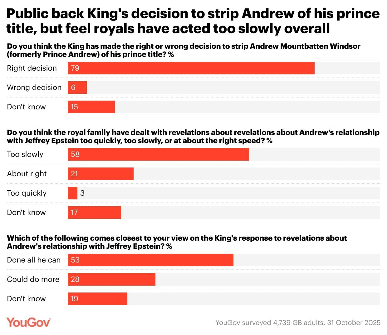 79% от британците смятат, че кралят е взел правилното решение, като е лишил Андрю от титлата му принц, но 58% казват, че кралското семейство е действало твърде бавно.