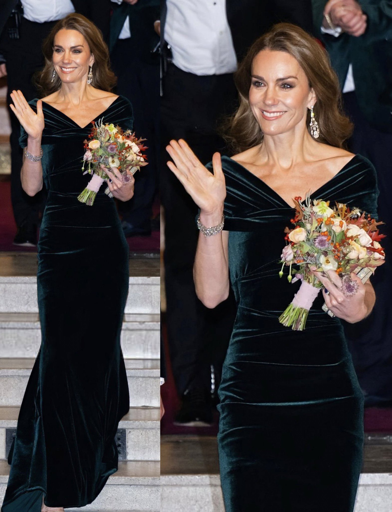 Нейната рокля, тъмнозелено кадифено творение, отдаде фина почит, тъй като е дело на базирания в Мюнхен лейбъл Talbot Runhof. Наречена Bobonne, тя е с широко V-образно деколте и пола тип „рибена опашка“. Моделът вече не се предлага за закупуване, което показва колко предварително принцесата и нейният екип планират тези ангажименти.