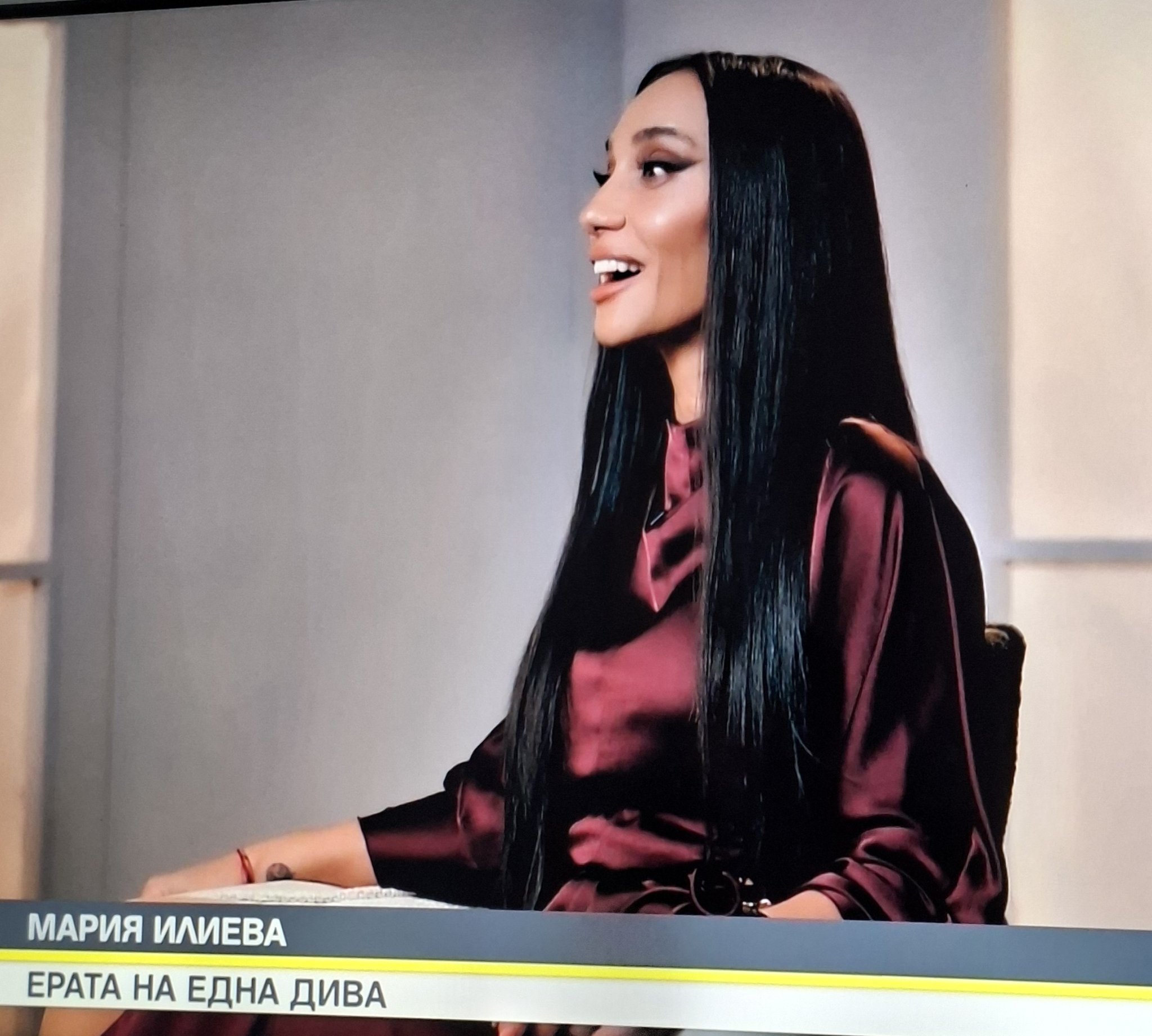 И за мен. Огромна очна линия, черни дълги коси, рокля в бордо - пръска от фаталност! Положението е Мортиша Гомес, трябва Илиева (е, според мен), да освежи и осъвремени стила си.