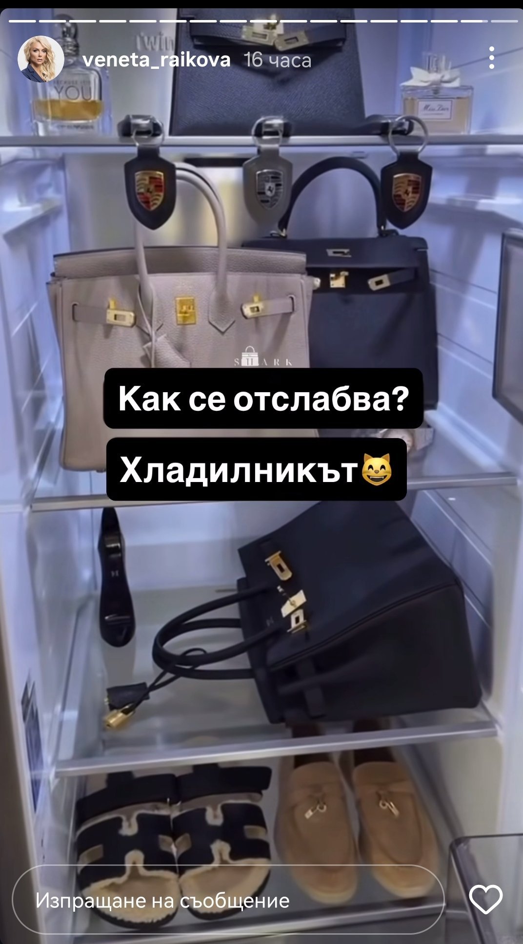Отваря вратата на хладилника и вътре няколко чанти Хермес, сандали Хермес, два парфюма. Честно казано, не вярвам да са нейни.