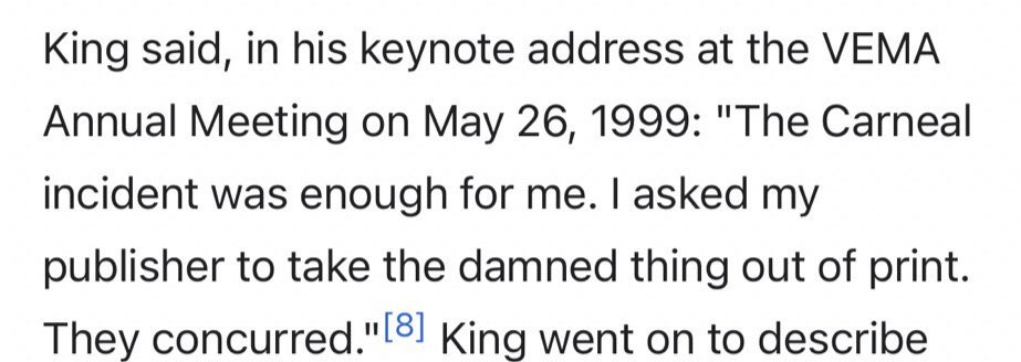Стивън Кинг забранява издаването на Гняв след стрелба в училище през 1999 г, когато се открива, че стрелецът може би е бил повлиян от книгата.
