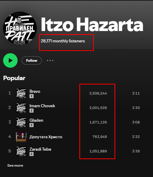 Стана ми интересно колко го слушат Хазарта в Спотифай -> 28000 месечно слушатели, при положение че последната му песен не я знам от кога е. Друг е въпросът Хазарта както какъв ще кара частна компания да си смени алгоритъма на работа. Youtube също не плащат на малки канали.