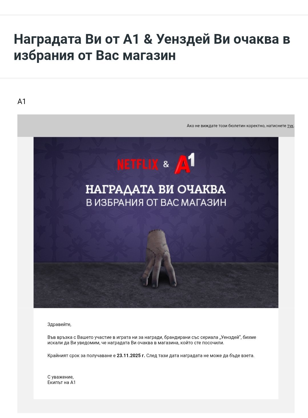 Получих днес потвърждение от A1 за наградата от филма Wensday.