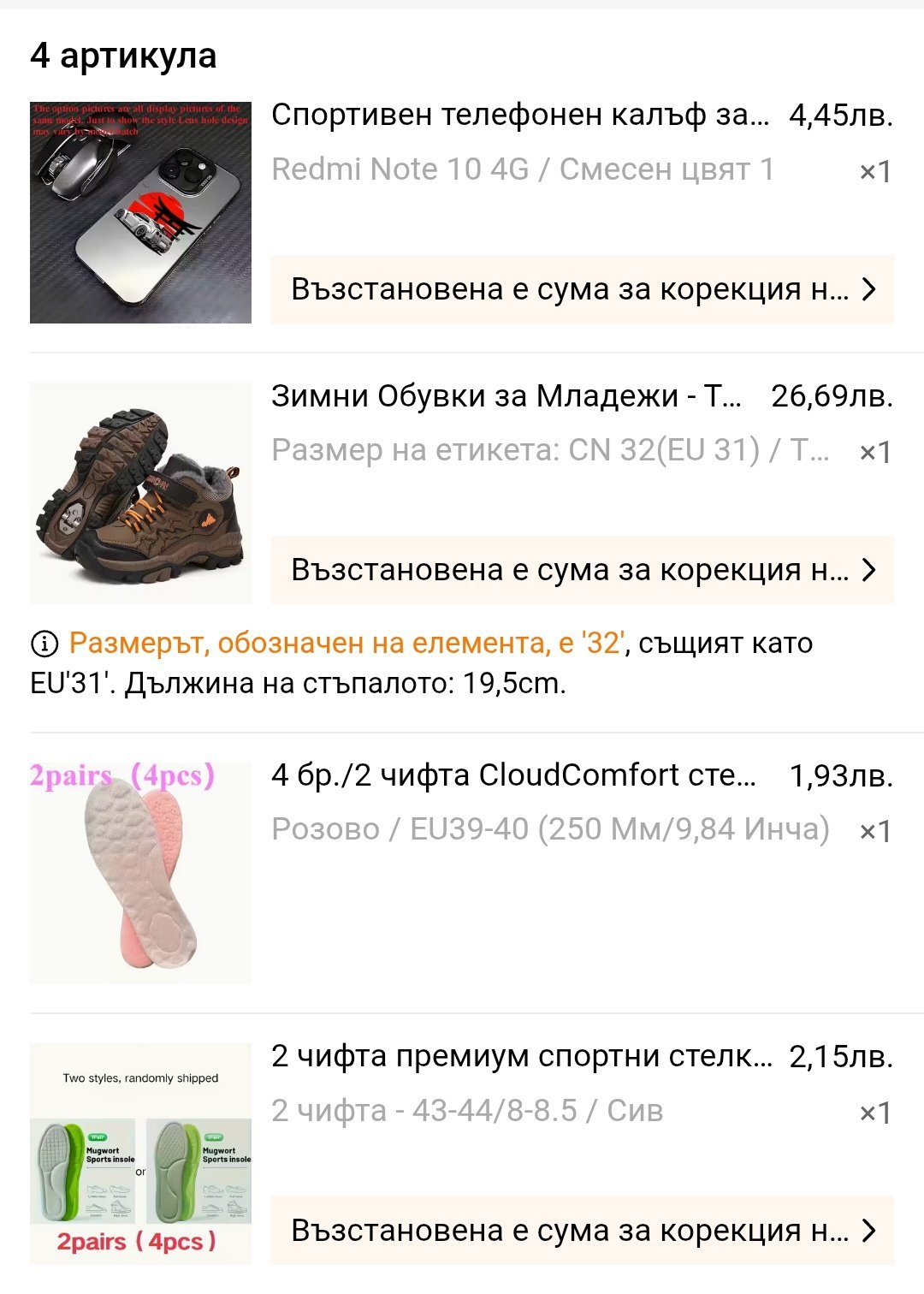 Калъф за телефона на детето - много е хубав, не очаквах, поръчах го набързо, без много да оглеждам. Стелките са ок, нормални стелки, още 2 комплекта други размери взех, да им аза всички вкъщи за смяна.Зимни маратонки, пак за сина, хубави са, добра изработка, номера отговаря, топли са, удобни са му.