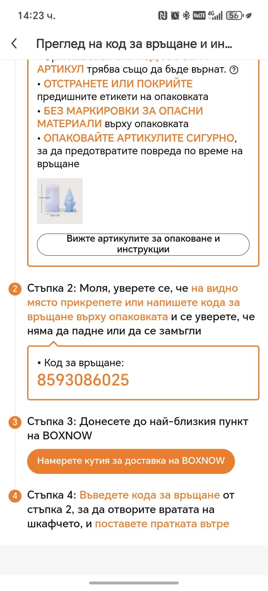 То разлика има, но информацията е една и съща, и пак ви казваме, това не е номера, вие вече не го виждате защото пратката е върната. Като пуснете ново връщане ще ви излезе нещо такова, код само цифри, като този код е номера и на товарителницата, и за отключване на кутията, и за проследяване!