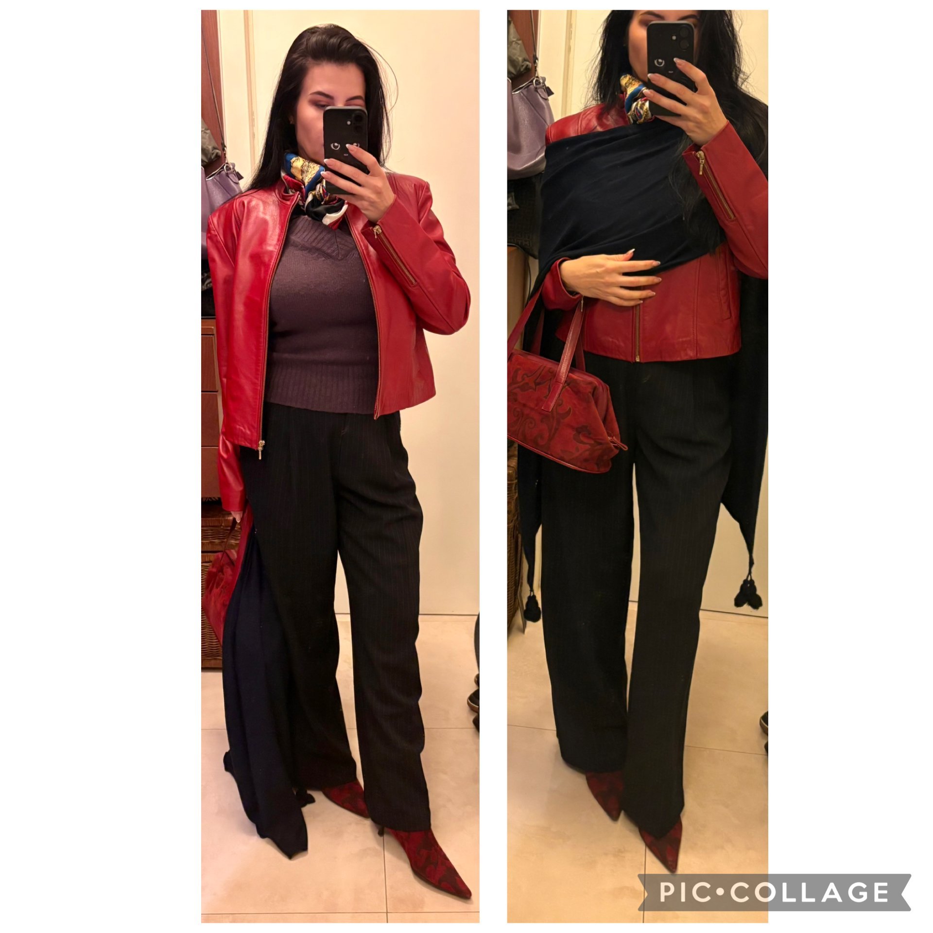Деси, на моя монитор виждам обувки, чанта, яке в червено, панталон, пончо в тъмно синьо и плуовер в лилаво. На втората снимка супер комбинация!
