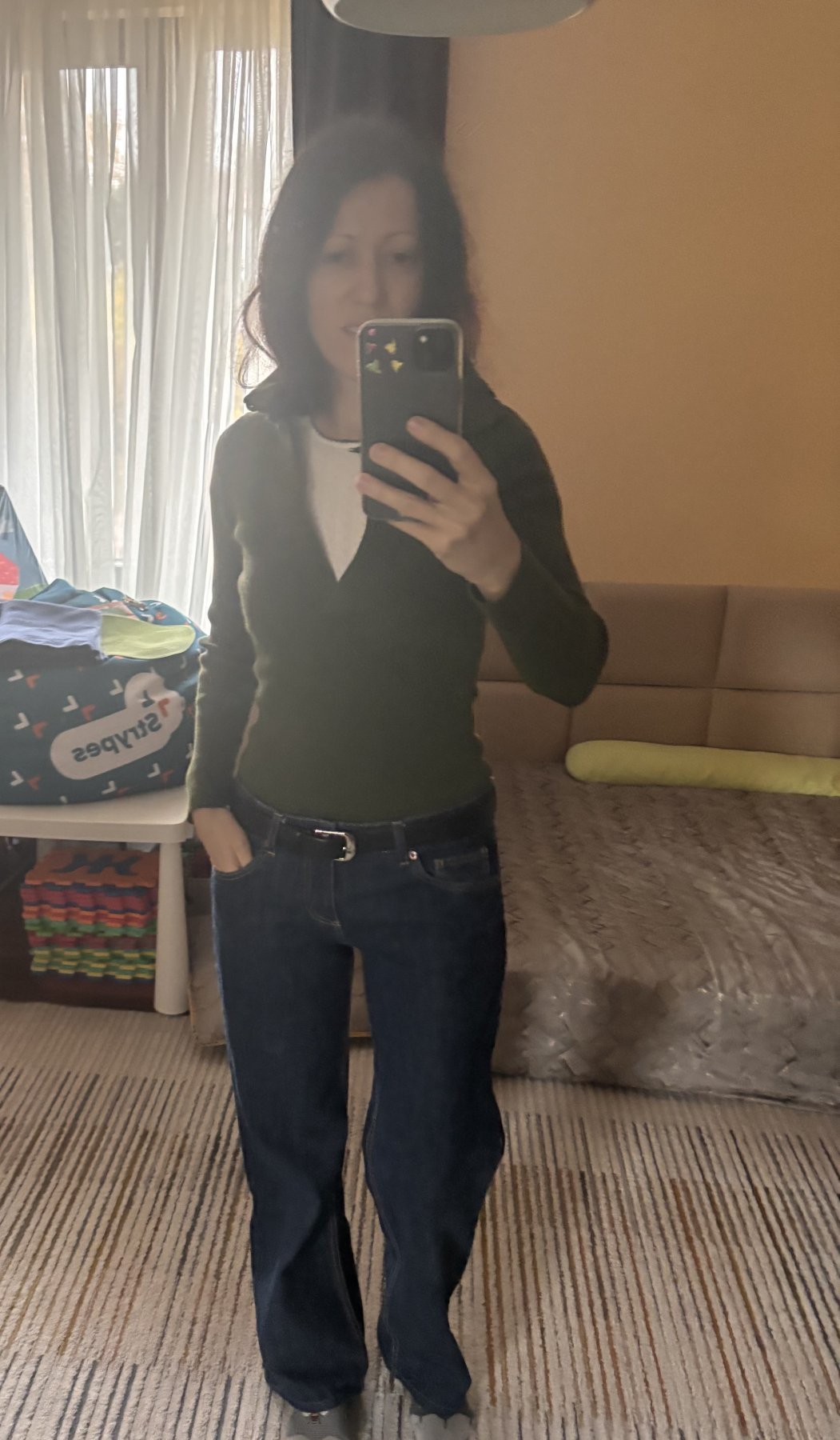 За мен е тайна как успявате да се снимате в огледалото без краката ви да изглеждат къси, една много лоша като качество снимка от днес, но се радвам че сложих кремаво до зеленото и го освежих и това благодарение на момичетата от темата