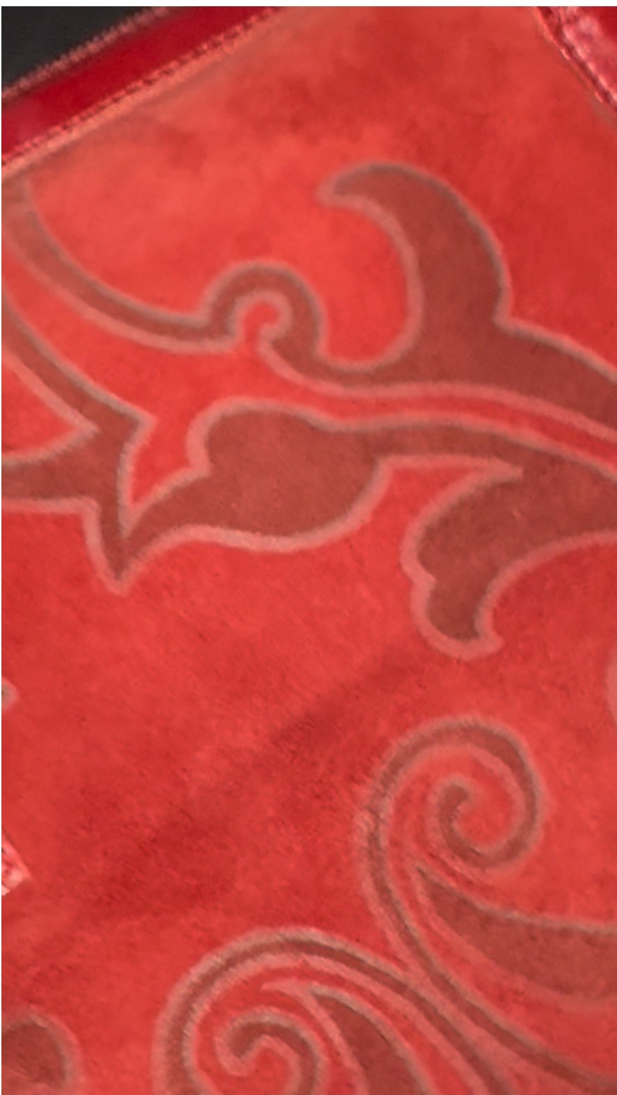 Съчетанието е тъмно малиненочервено с бургунди към лилалво, но на гази светлина не се вижда.