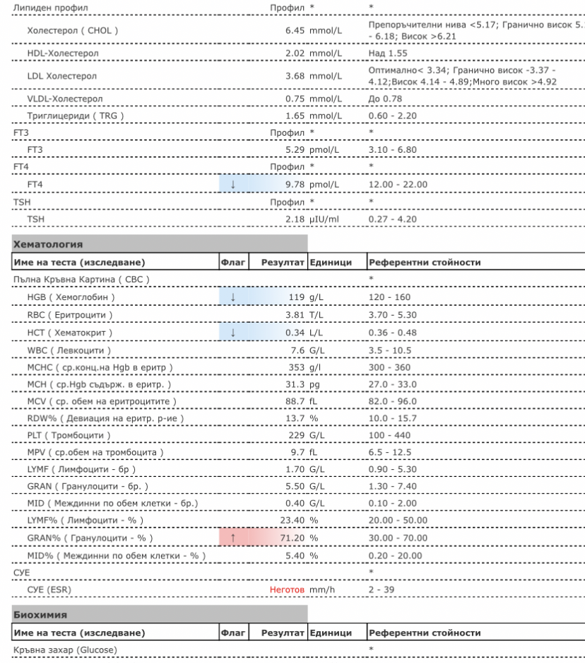 Здравейте, бих отишла на ендокринолог направо, след като АГ не предприема нищо, просто за да съм спокойна за себе си. Обърнете внимание и на занижения хемоглобин, бих пуснала желязо, феритин и Б12.