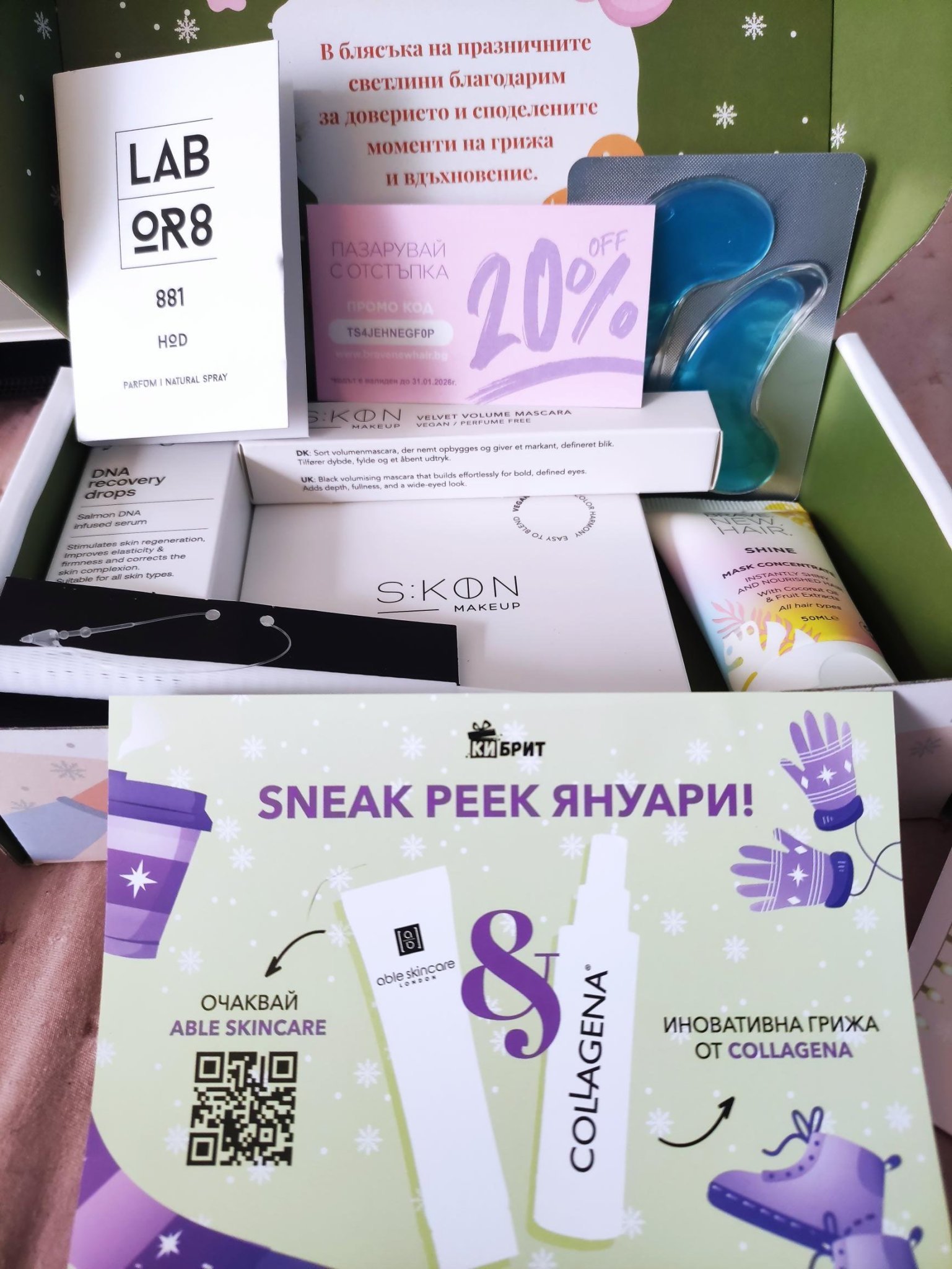 На Скон палитрата сенки + четка за сенки + спирала за обем; мостра парфюм на Лабор 8; пачове за очи на Авант (добре, че е нещо дребно на "любимата" марка); маска за коса за блясък на Brave New Hair + код за 20 процента отстъпка - TS4JEHNEGF0P, валиден до края на януари 2026; и серума на yenges. През януари ще има нещо от Колагена и нещо от Able Skincare