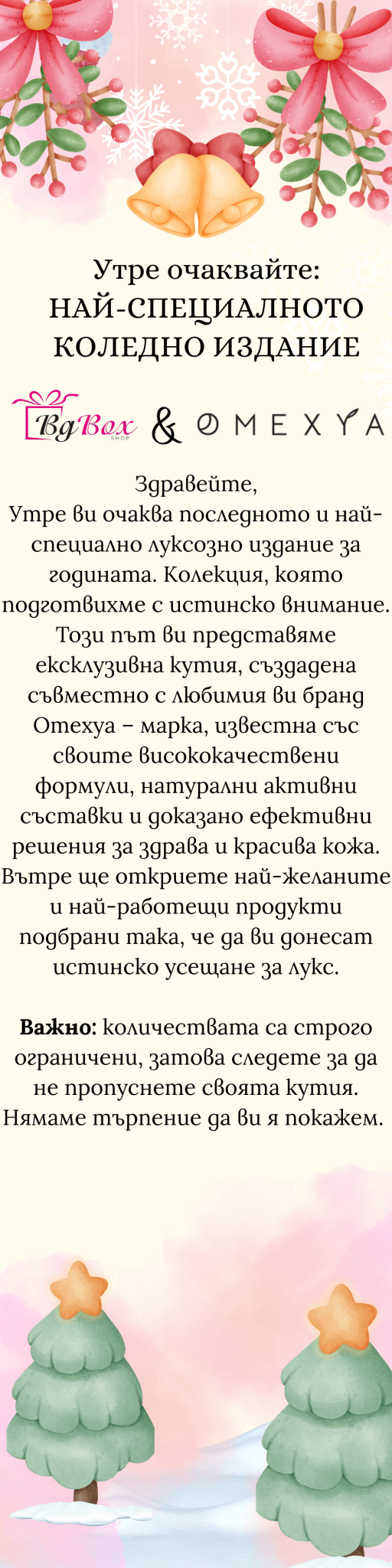 На OMEXYA съм ползвала нощния крем, даде ми го колежка от кутия, много ми хареса - лек, добре хидратира и има хубав състав. Иска ми се да я взема тази кутия , но прекалих ноември с покупките и просто ме е срам пред домашните -  аз да съм най-важна и всеки ден по нещо да си взимам.