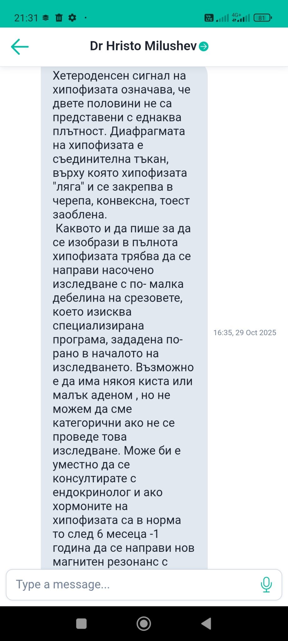 Ако е възможно да има нещо на хипофизата и имаш насочващи към това симптоми,  мисля,  че  трябва да уточниш.Това. ЯМР не казва, че ти няма нищо, а че не може да види, дали и какво има.