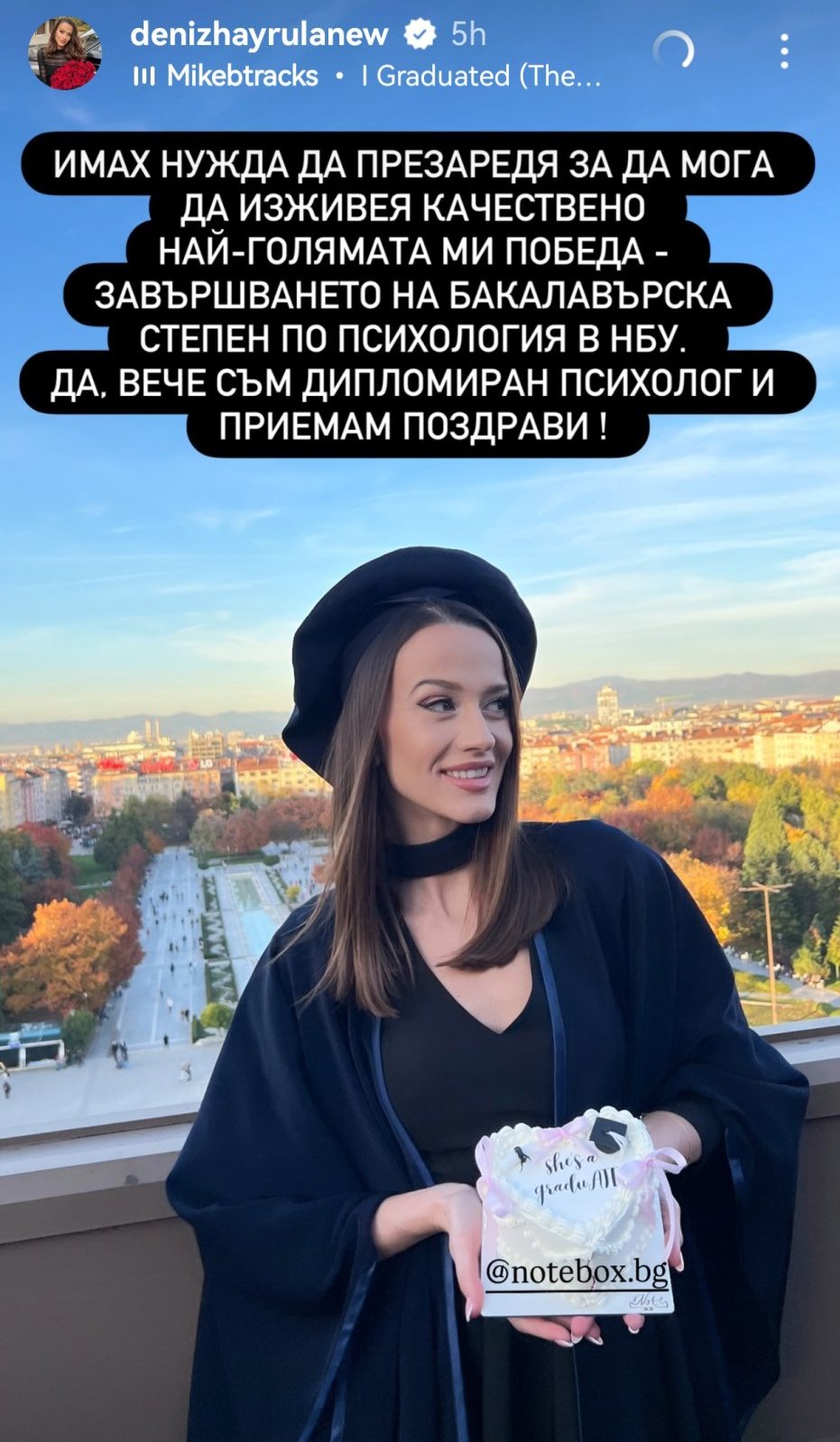 Аз честно казано харесвам поведението на Дениз сега, не съм я гледала преди, много добре се изразява, не се е изложила с нищо във формата, видях, че се е дипломирала, викам си браво и.....попаднах на клипчето с бутилката, отпразнуването на дипломата ѝ, тя лично си го беше качила на стори....Ами рязко ми падна в очите и олекна. Защо по дяволите? Какво искаш да демонстрираш с това?